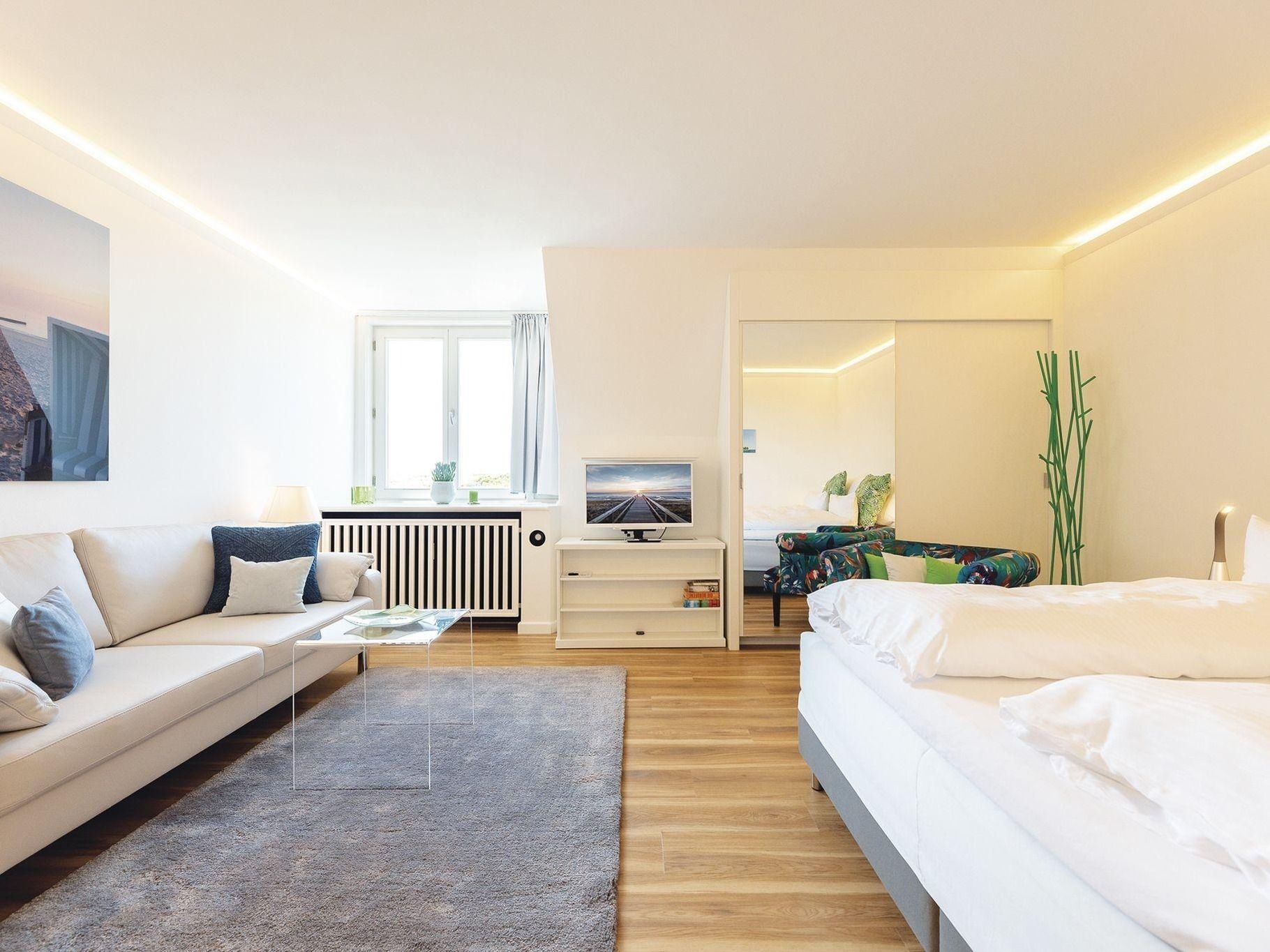 In diesem schnuckeligen Einraumwunder im 1.Obergeschoss eines gediegenen Appartementhauses genießen Sie die absolute Ruhe, nur unterbrochen von Wind und Möwen, oberhalb des Roten Kliffs. Die Küche liegt separat und verfügt über einen Zwei-Platten-Herd. Das Duschbad ist in elegantem Petrol gehalten. Der kombinierte Wohn-/Schlafraum wartet mit Essecke für Zwei, bequemem Doppelbett und gemütlicher Sofaecke mit Dünenblick auf. Ein herrlicher Rückzugsort zu jeder Jahreszeit für Paare und Alleinreisende.