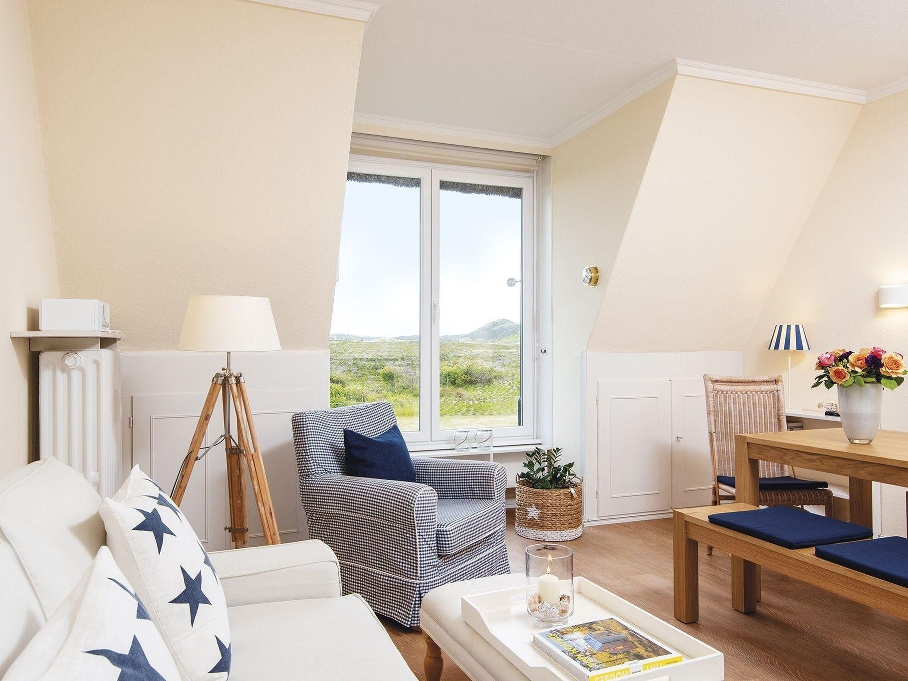 Diese schmucke Etagenwohnung im ersten Obergeschoss eines gediegenen Appartementhauses wartet mit einem freundlich hellen Wohn-/Essbereich samt tollem Ausblick nach Süden über die Dünenlandschaft bis zum Kampener Leuchtturm langer Christian auf. Ebenfalls auf dieser Etage befinden sich die separate funktional eingerichtete Küche und das Duschbad mit einem Waschtrockner. Eine friesisch-schmale Treppe führt hinauf ins gemütliche Schlafzimmer für Zwei mit Einbauschränken unter der Schräge und einer zusätzlichen Sitzecke samt TV. Alle Räume sind mit Fliesen und Laminat ausgelegt, die Treppe hat Teppichboden.