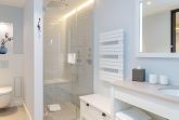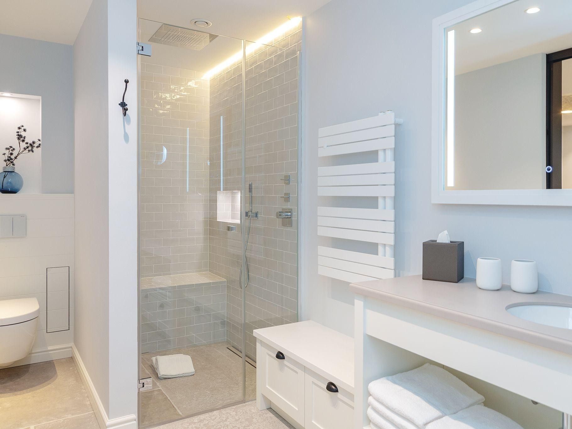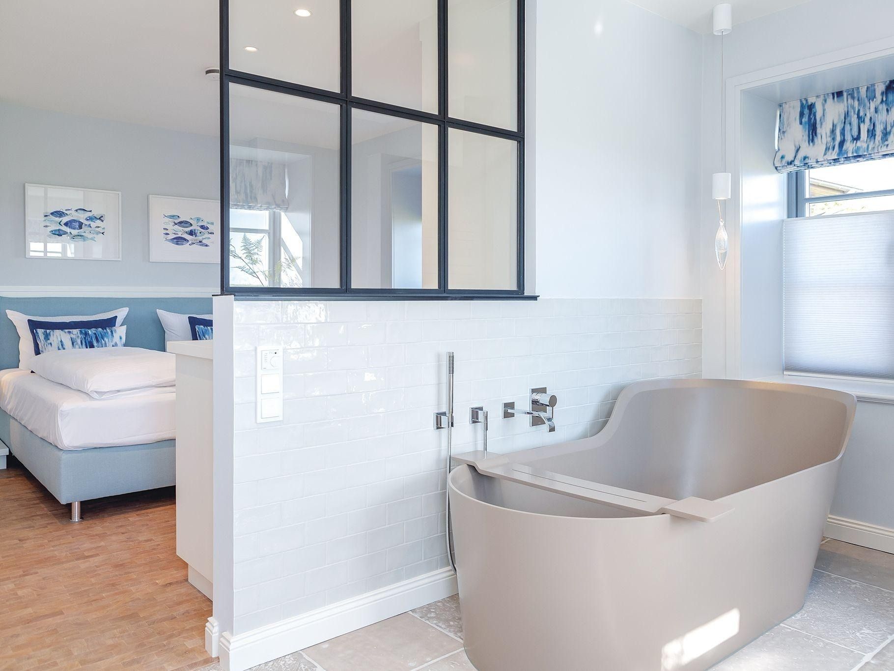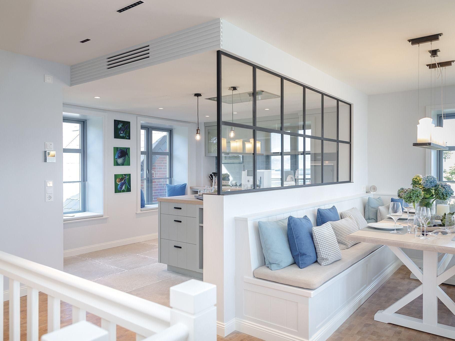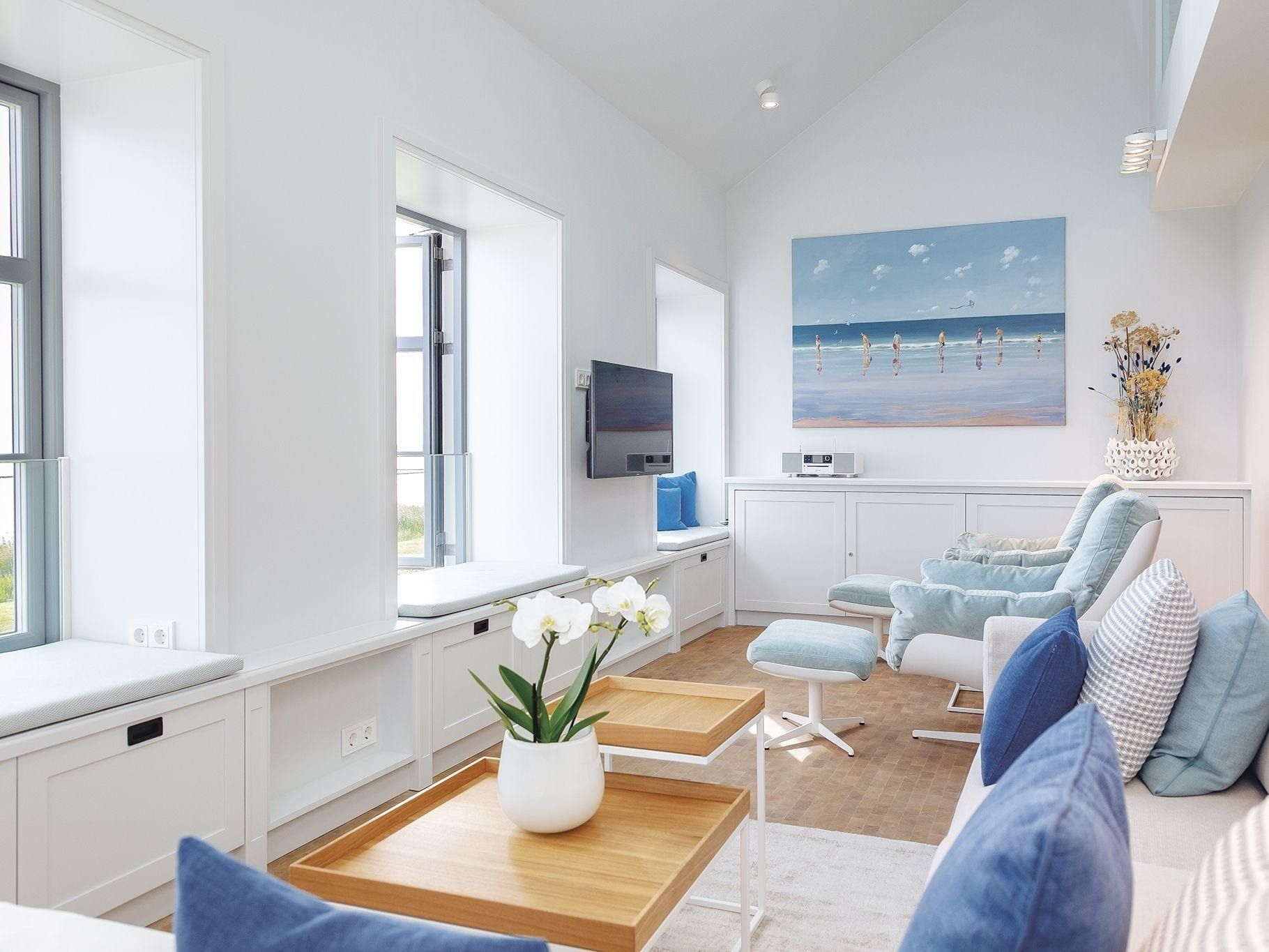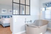 Früher geschäftiges Packhaus am Keitumer Hafen - heute exklusiver Logenplatz mit unvergleichlichem Wattblick. Dieses exklusive Ferienquartier gehört nicht ohne Grund zu den Keitumer Geschichtspunkten - das Endhausteil für bis zu sechs Gäste lässt keine Wünsche offen. Im ebenerdigen Eingangsbereich auf der Westseite finden Sie große Einbauschränke und ein Gäste-WC. Ein elegantes Doppelschlafzimmer samt Bad mit Dusche und Wanne schließen an. Von hier haben Sie auch Zugang zu der privaten Terrasse mit unvergleichlich schönem Wattblick gen Sonnenaufgang. Über eine elegante Treppe erreichen Sie das stilvoll eingerichtete Untergeschoss mit extragroßem Spiegel und vielen Einbauschränken. Nebenan erwartet Sie ein weiteres nicht minder behagliches Doppelschlafzimmer und ein Bad mit XXL-Dusche en suite. Im 1. OG meint man über dem Watt zu schweben. Von dieser komplett offen gestalteten Etage mit voll ausgestatteter Küche, einladend großem Esstisch, Elektro-Gaskamin, Gäste-WC und Sofas vor den Fenstern mit atemberaubendem Wattblick erreicht man die offene Galerie im 2. OG. Hier halten dann Wellness und Achtsamkeit Einzug. Neben dem Doppelbett mit freiem Blick in den Sternenhimmel durch die riesigen Dachfenster, gibt es hier auch eine gläserne Dusche mit Ausblick und eine Sauna für Zwei. Das ganze Hausteil ist mit edelsten Materialien ausgestattet, die Böden sind mit Naturstein und Echtholz ausgelegt.