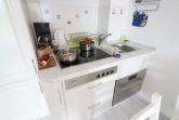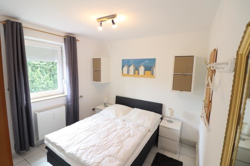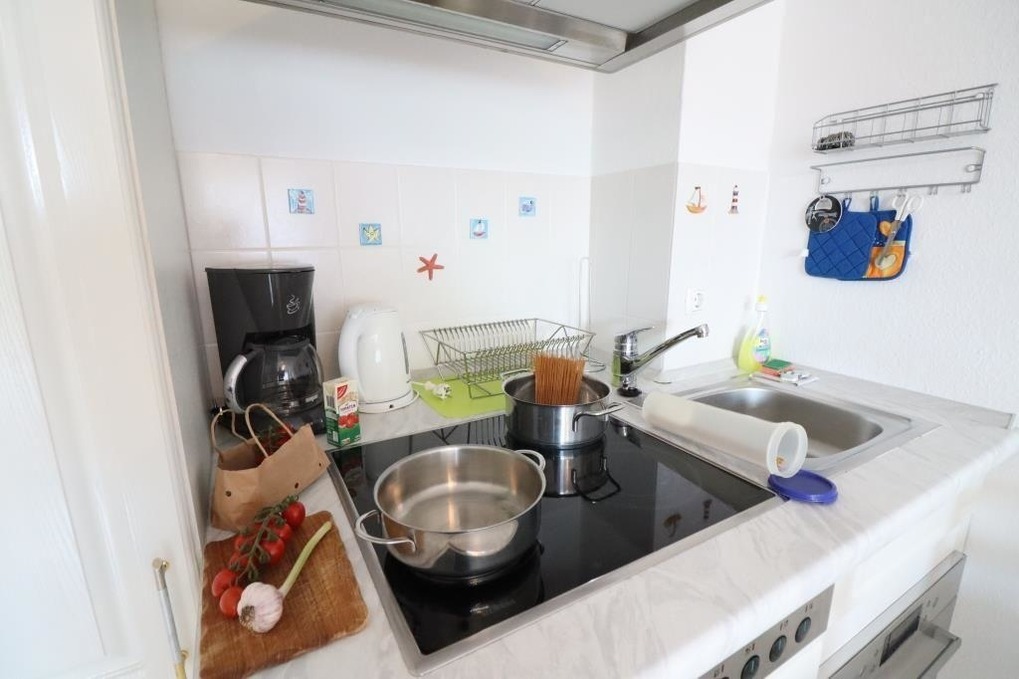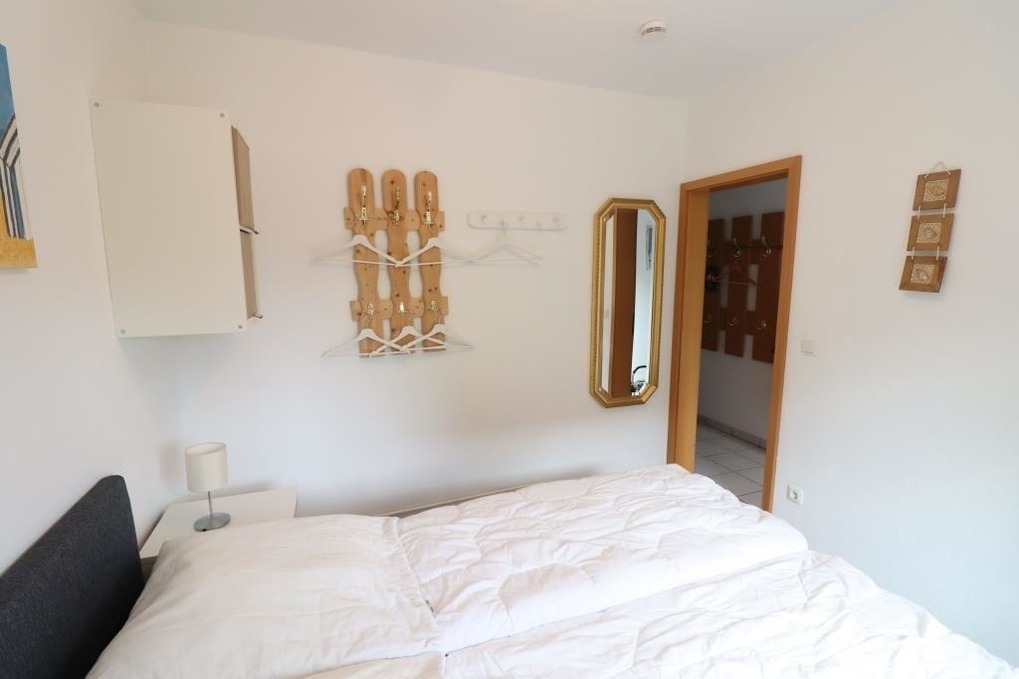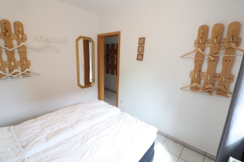 1 Schlafraum mit franz. Bett im Erdgeschoss, 1 Schlafraum mit Doppelbett im Souterrain, Treppengitter ist vorhanden, 1 Wohnraum mit integrierter Küchenzeile, Kühlschrank und Mikrowelle.