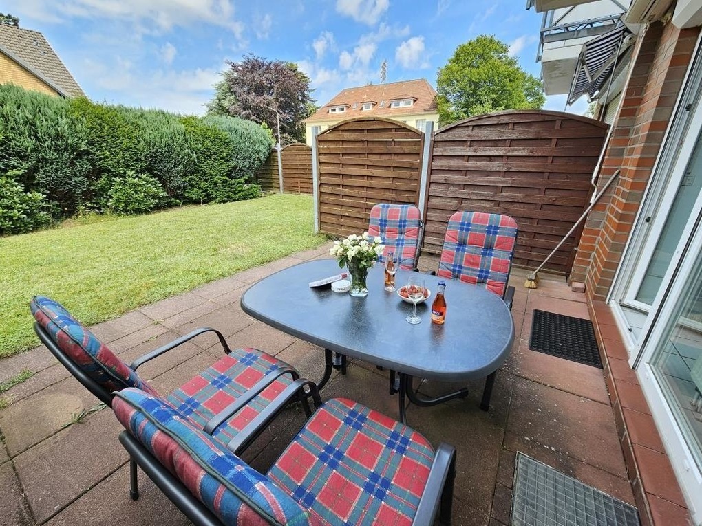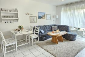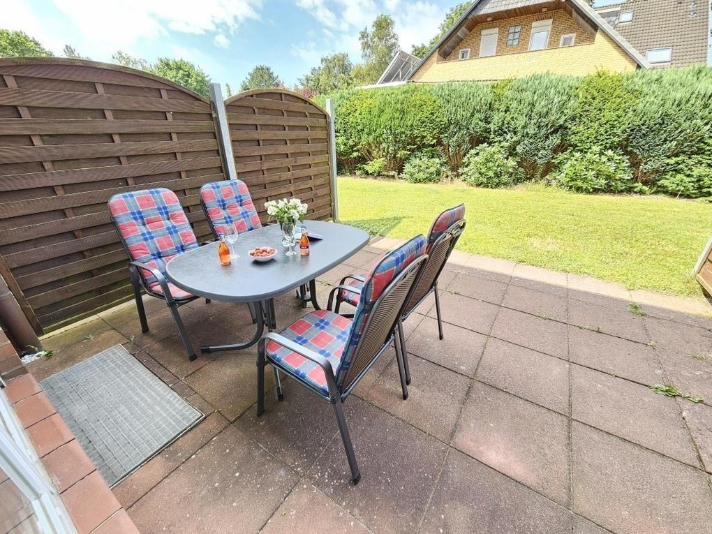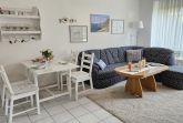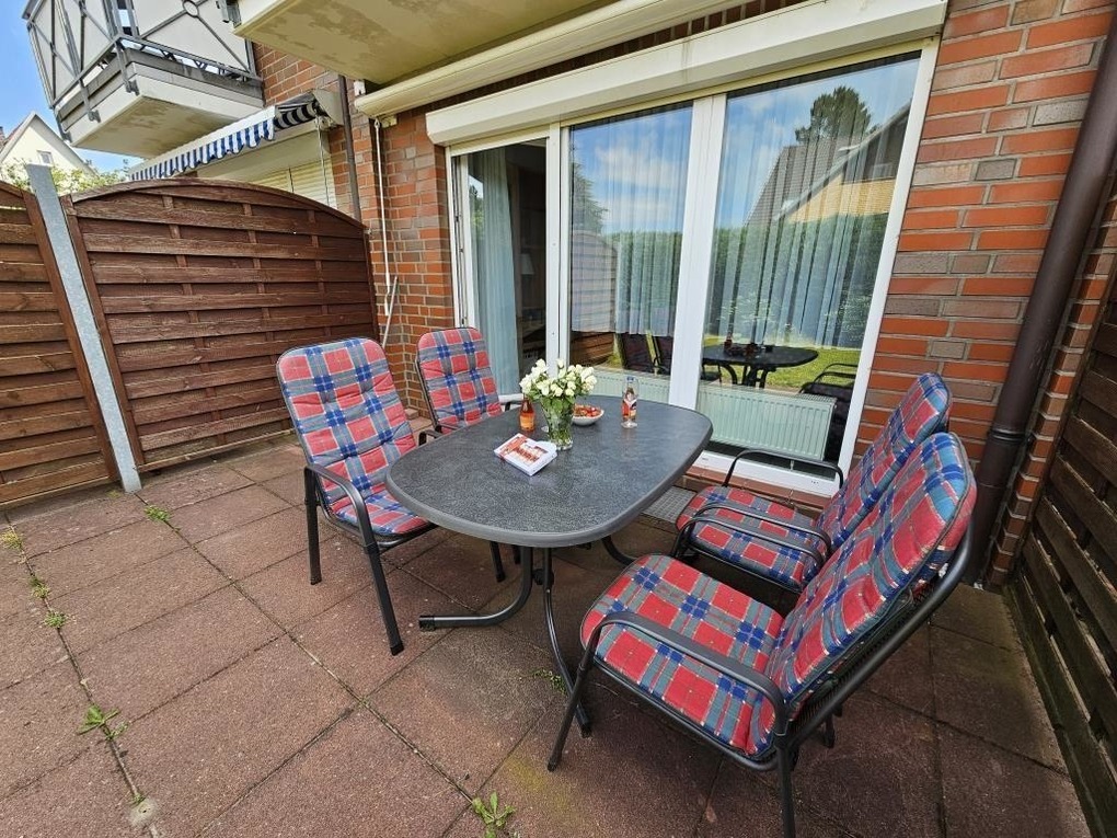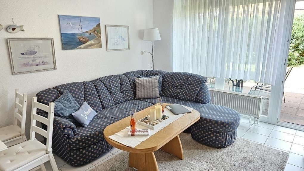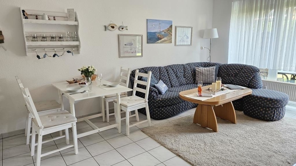 Gemütliche Ferienwohnung für bis zu 4 Personen mit schöner Westterrasse und Garten, 1 Schlafraum mit franz. Bett im Erdgeschoss, 1 Schlafraum mit Doppelbett im Souterrain, Treppengitter ist vorhanden, 1 Wohnraum mit integrierter Küchenzeile, Kühlschrank und Mikrowelle, Gartenmöbel sind auf der Terrasse vorhanden, Dusche / WC, WLAN kostenlos vorhanden, keine Haustiere erlaubt, Parkplatz am Haus, ca. 1000m vom Strand entfernt