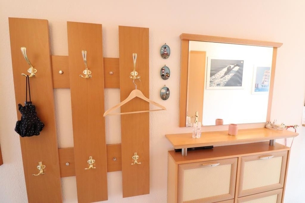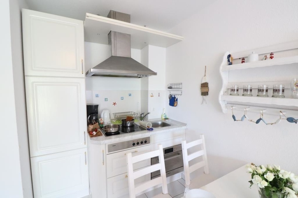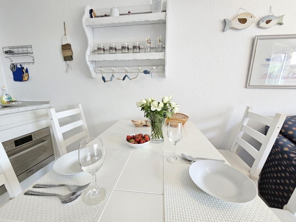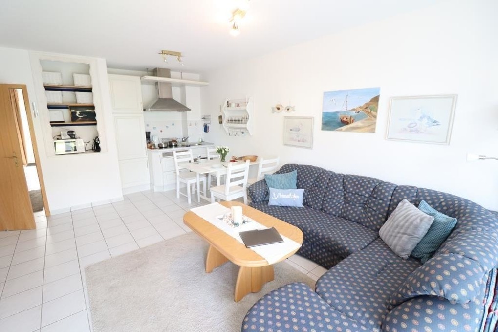 Gemütliche Ferienwohnung für bis zu 4 Personen mit schöner Westterrasse und Garten, 1 Schlafraum mit franz. Bett im Erdgeschoss, 1 Schlafraum mit Doppelbett im Souterrain, Treppengitter ist vorhanden, 1 Wohnraum mit integrierter Küchenzeile, Kühlschrank und Mikrowelle, Gartenmöbel sind auf der Terrasse vorhanden, Dusche / WC, WLAN kostenlos vorhanden, keine Haustiere erlaubt, Parkplatz am Haus, ca. 1000m vom Strand entfernt