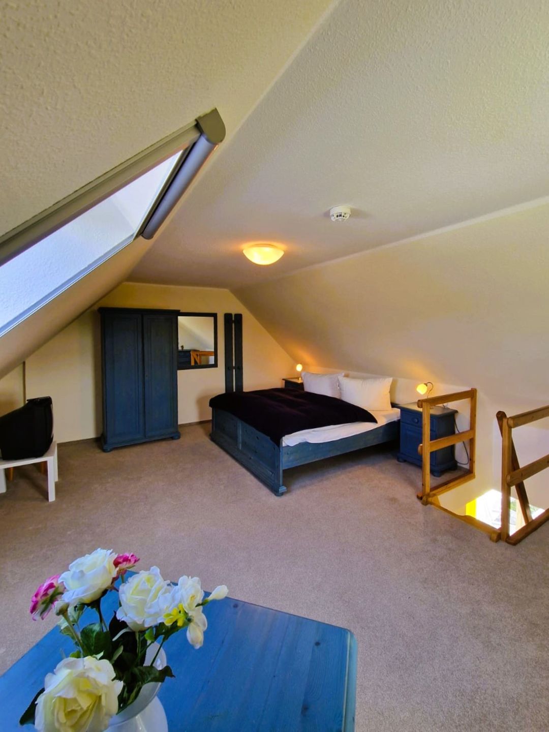 OG, Balkon, Wohnzimmer mit Küchenzeile (Kühlschrank ohne Gefrierfach), Schlafcouch, SAT-TV, Dusche/WC, Fön, Schlafzimmer