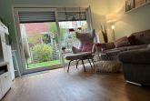 Vom Wohnzimmer aus gelangen Sie auf die Terrasse und den Garten, die durch Hecken, Bäume und Sträucher vor neugierigen Blicken schützen. Dort stehen ein Tisch, Stühle und eine Bank sowie eine Sonnenliege für Sie bereit.