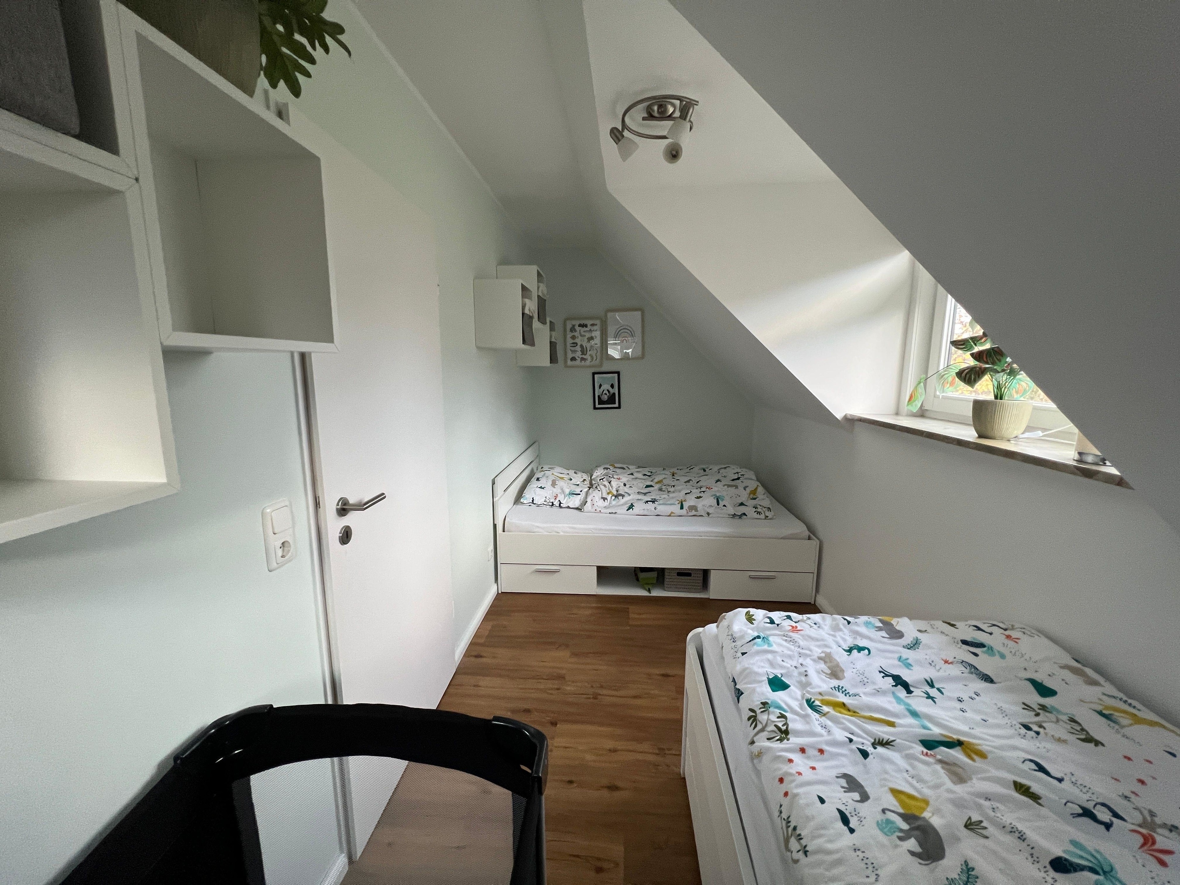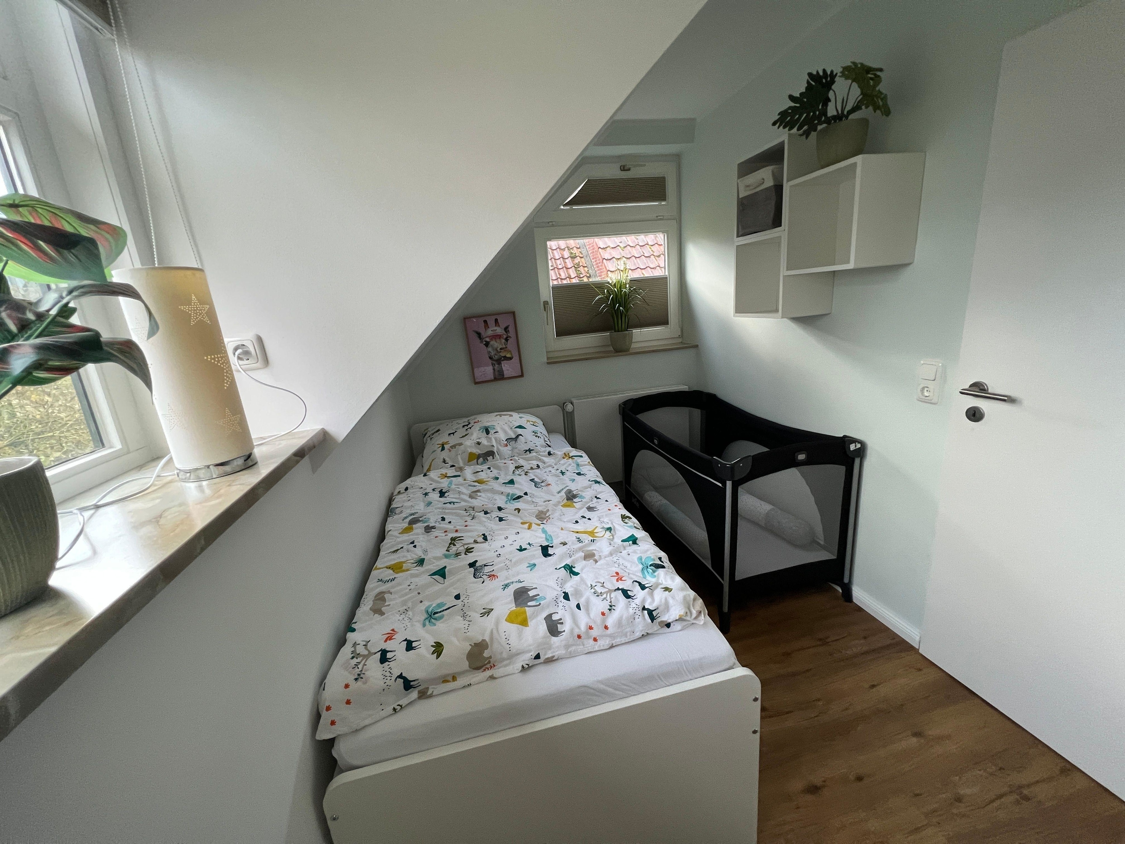 Im Kinderzimmer stehen zwei Einzelbetten (90x200cm und 140x200cm) - bei Bedarf auch ein Baby-Reisebett mit Neugeborenemaufsatz.
