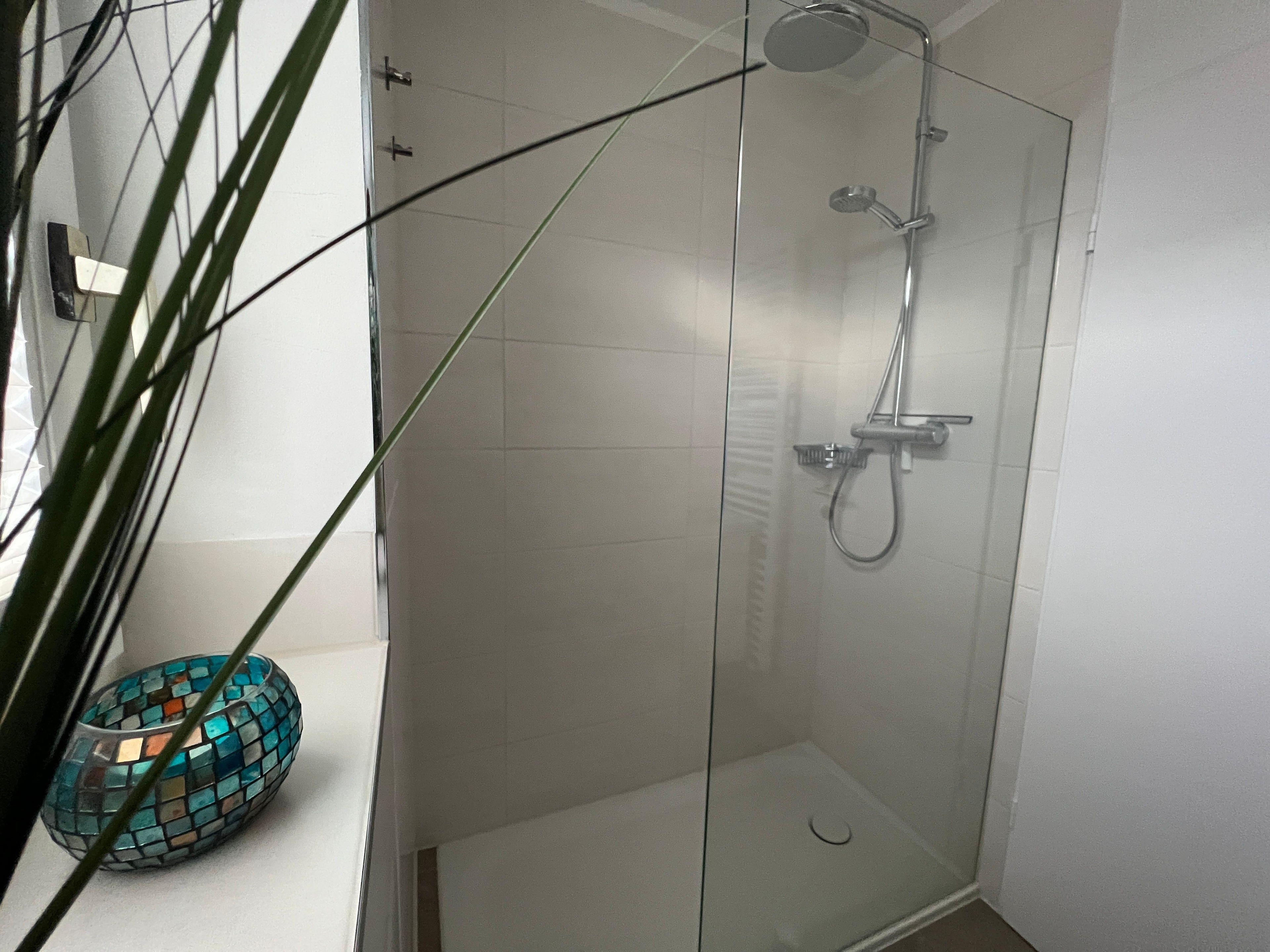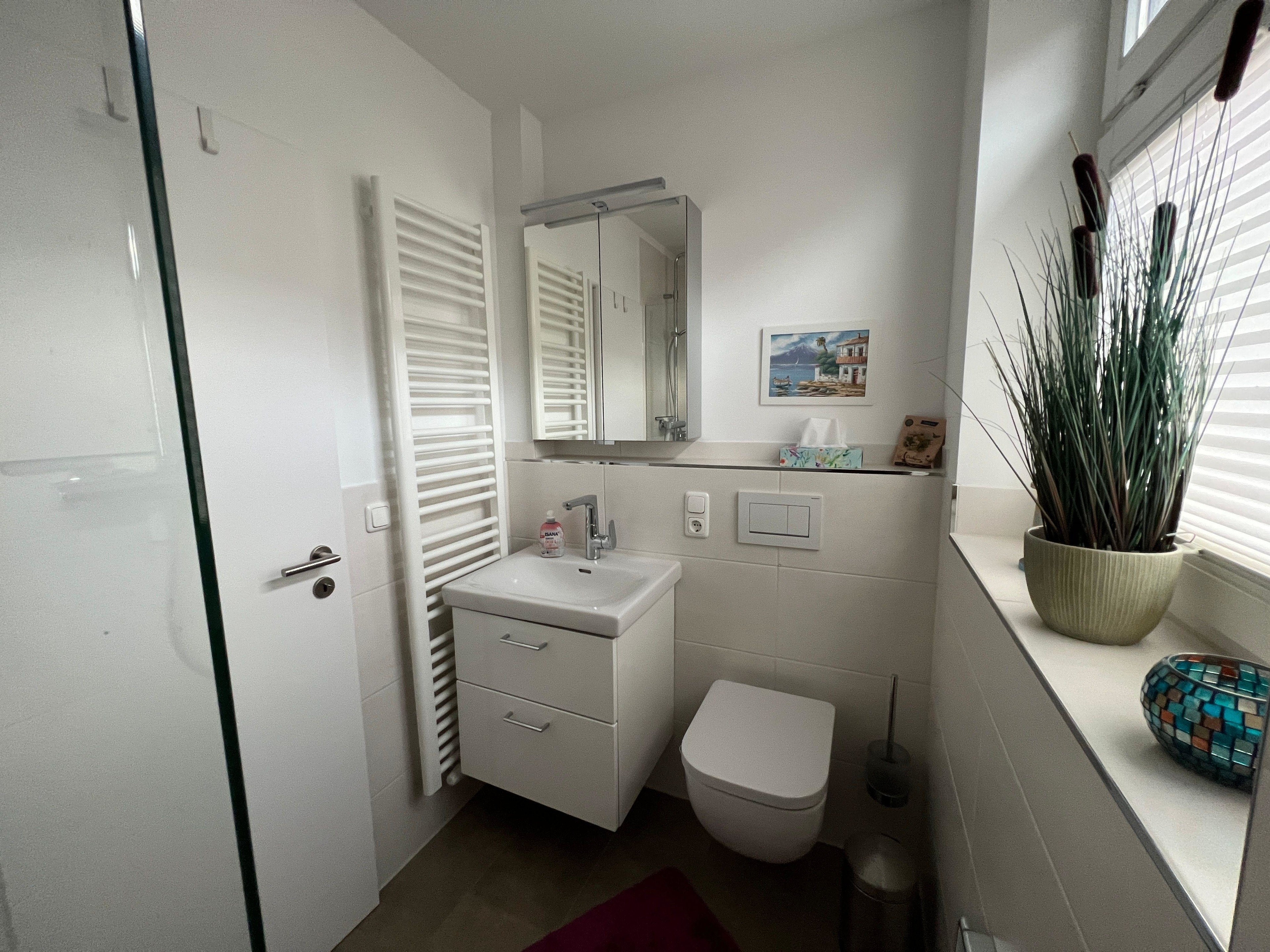 Ein Badezimmer mit ebenerdiger Dusche und komfortablem Waschtisch mit Spiegelschrank und Stauraum gehören ebenso dazu.