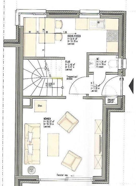 Im Erdgeschoss befinden sich zudem ein kleiner Abstellraum und eine Toilette.
