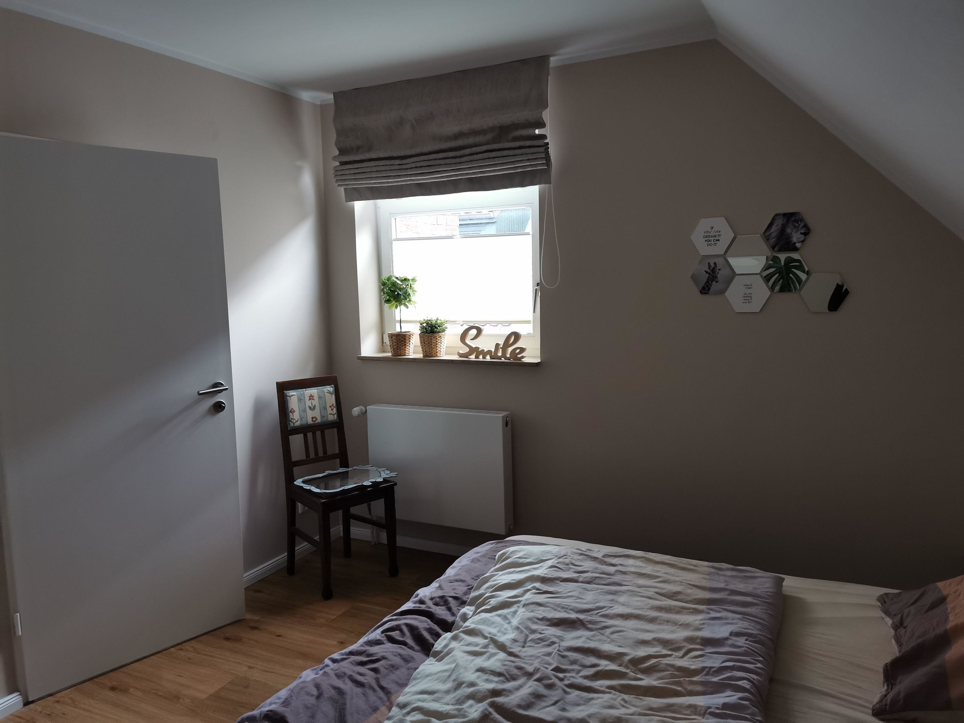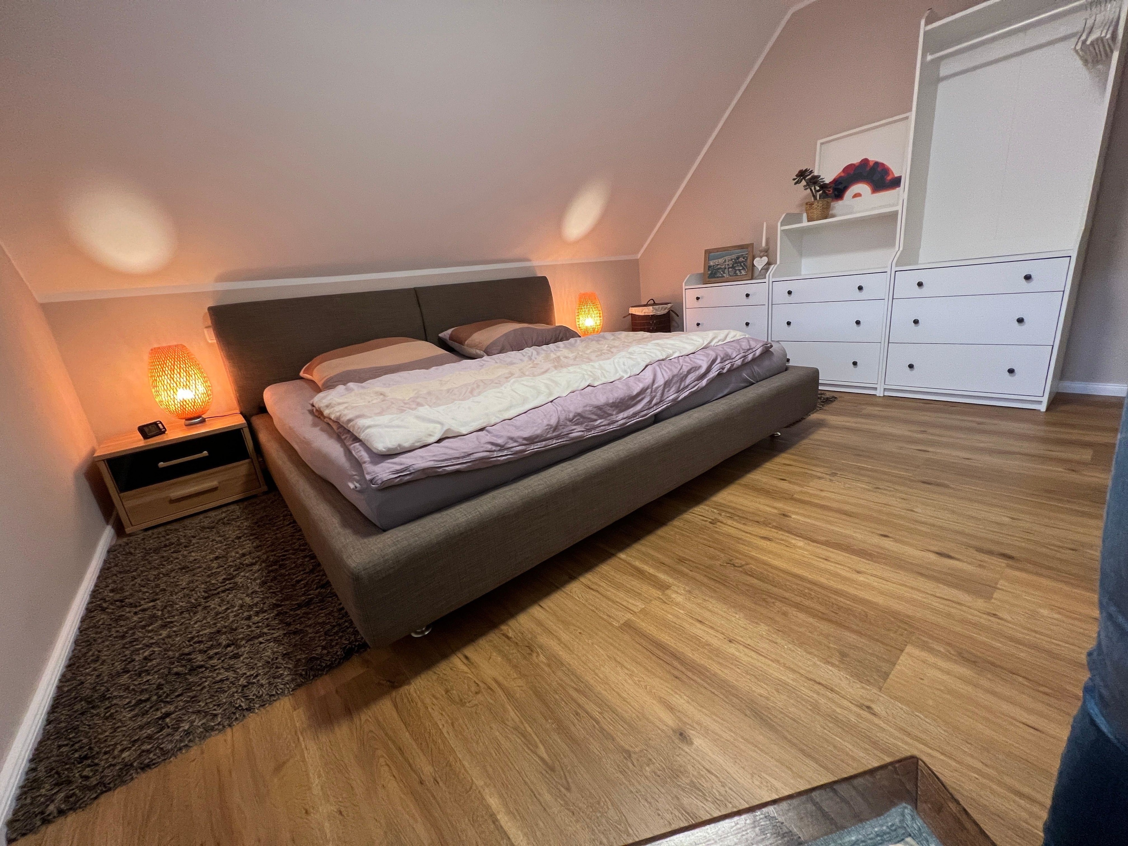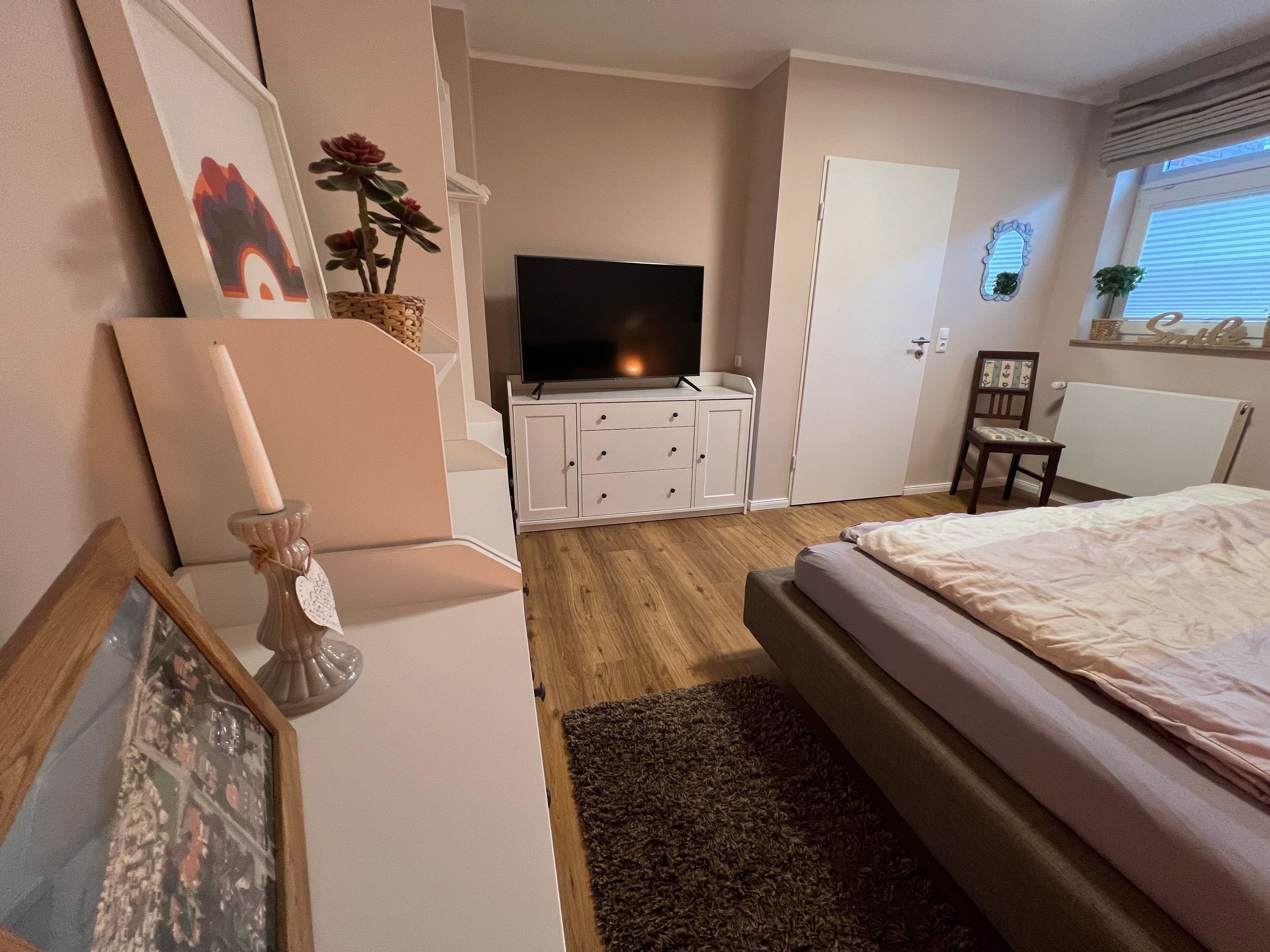Im Obergeschoss befinden sich ein großes Schlafzimmer mit einem Doppelbett (180x200cm), Kleiderschrank und einem 55 Zoll großem SMART-TV.