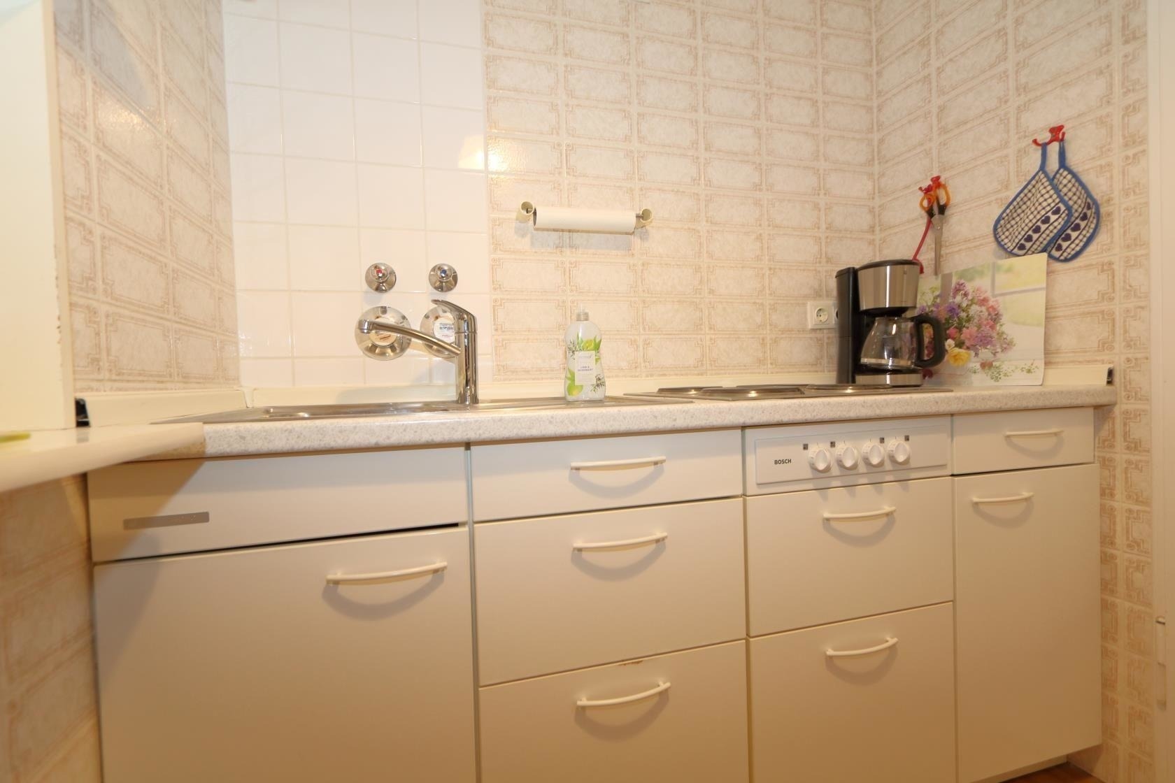 Die Ferienwohnung bietet eine komfortable und allergikergeeignete Unterkunft für erholsame Tage. Sie verfügt über ein geräumiges Wohnschlafzimmer, das mit einem Doppelbett ausgestattet ist, sowie zwei weitere Doppelbetten in den separaten Schlafzimmern. Die Küchenzeile ist vollständig ausgestattet und beinhaltet einen Elektro-/Gasherd, Mikrowelle, Kühlschrank, Kaffeemaschine, Toaster sowie eine Gefriermöglichkeit, um die Zubereitung von Mahlzeiten zu erleichtern.