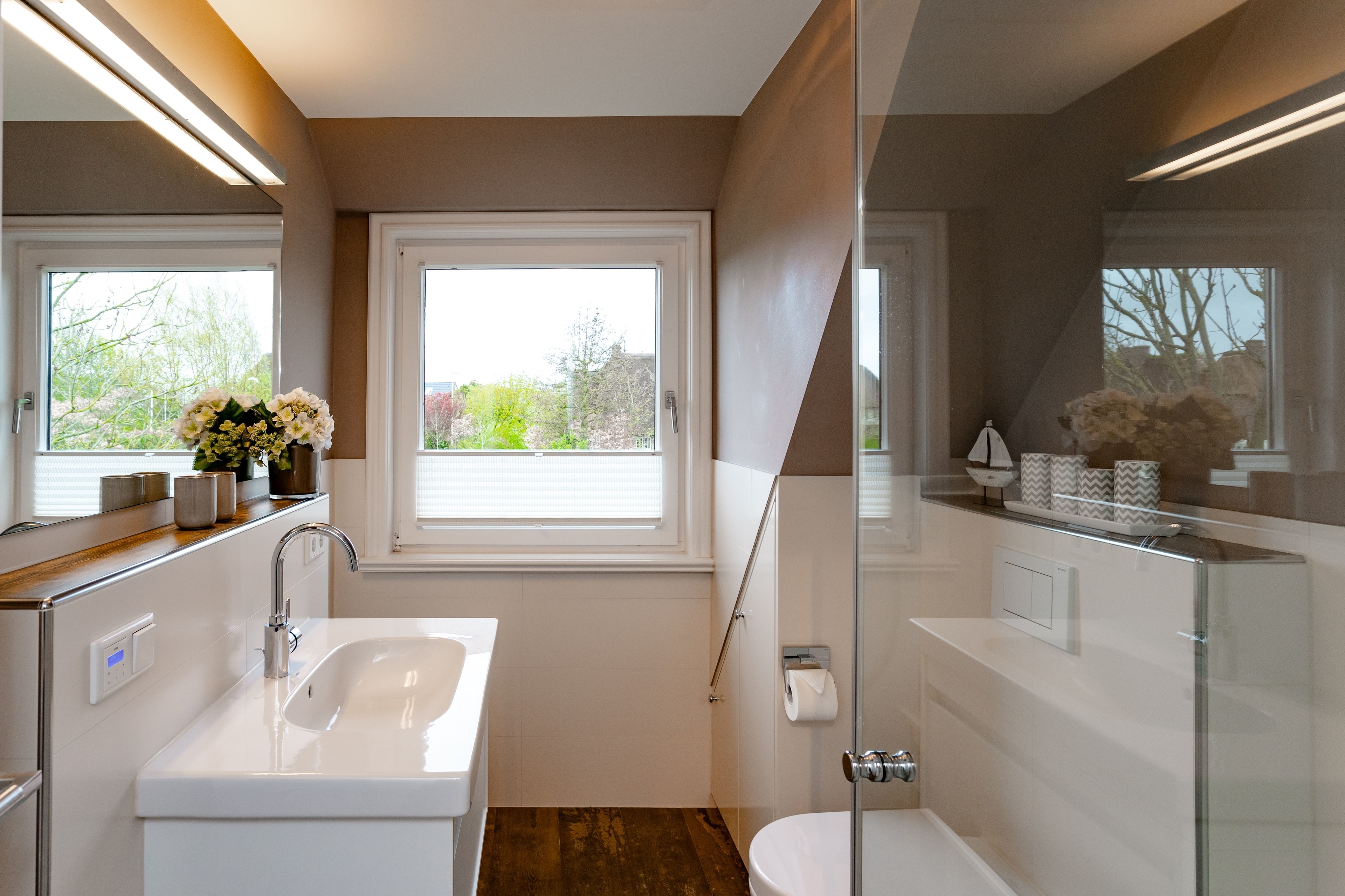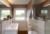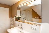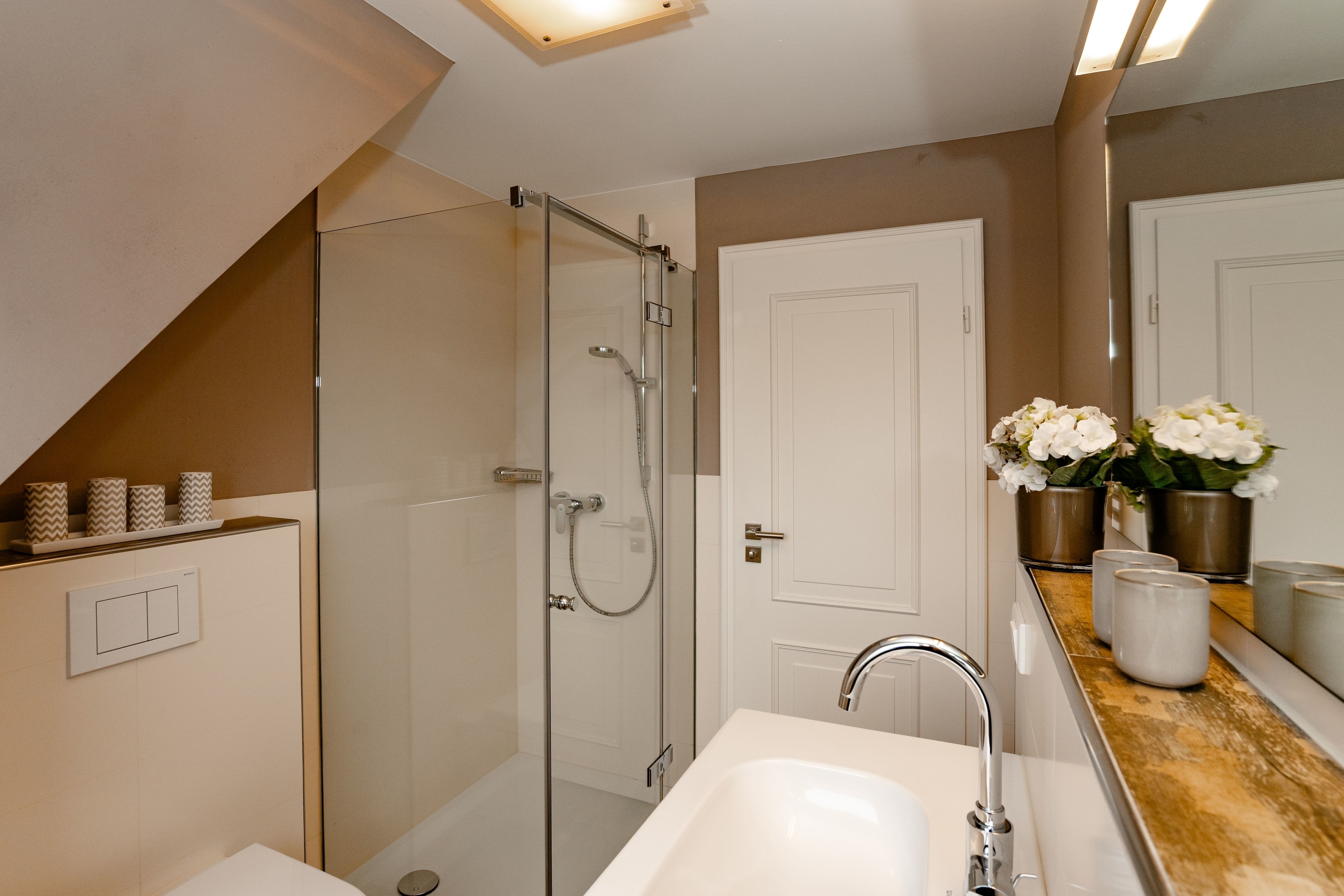 Das Badezimmer ist ebenfalls modern gestaltet und verfügt über eine geräumige Dusche, stilvolle