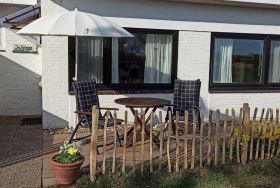 Die Süd-Terrasse und der eigene Eingang machen unsere Ferienwohnung Im Grünen so besonders.