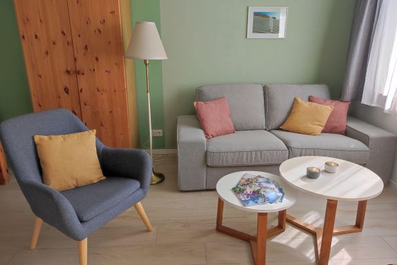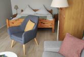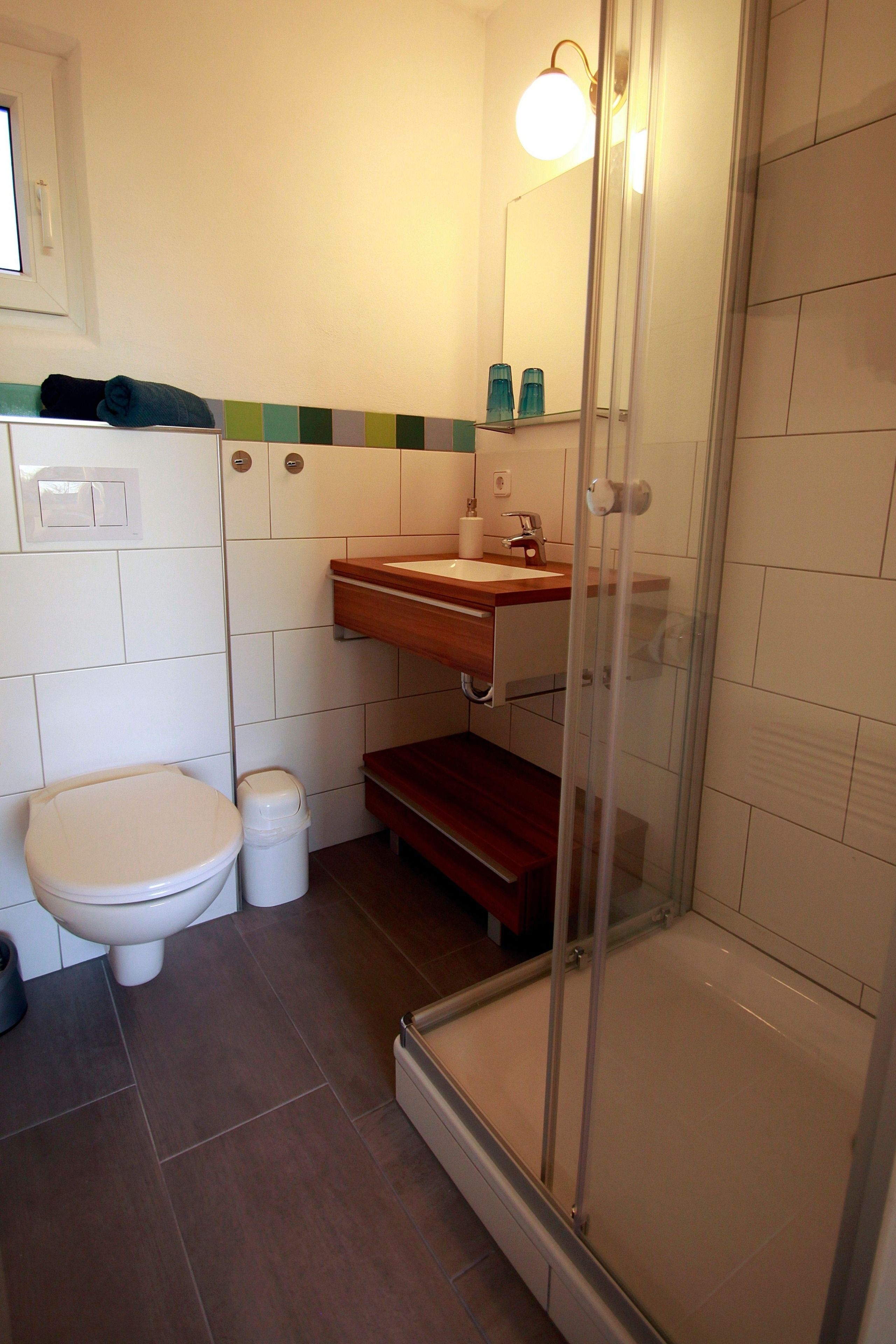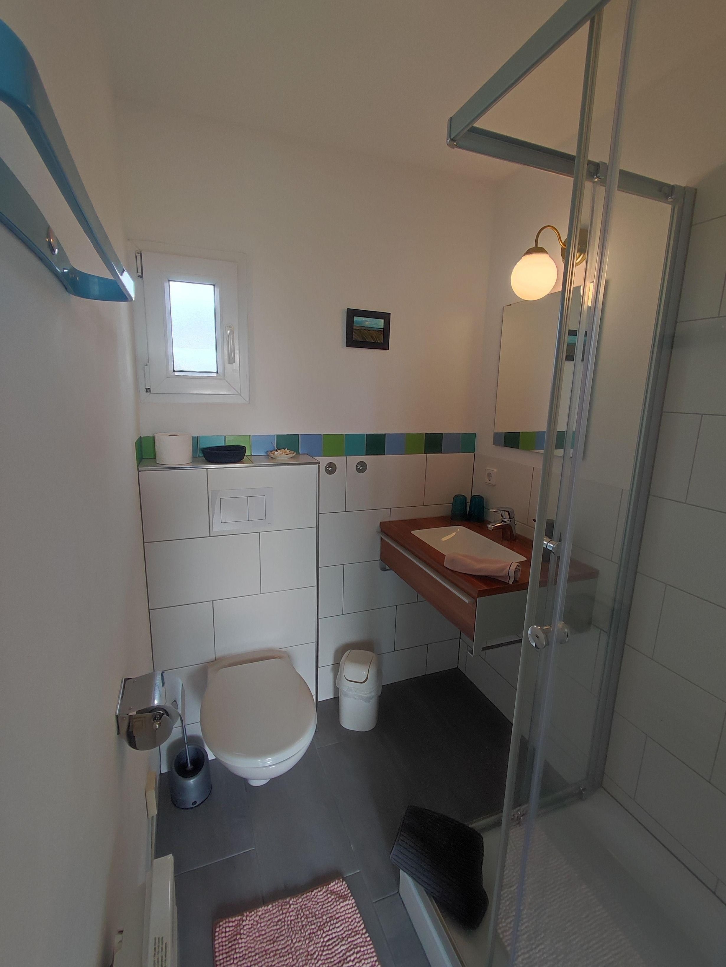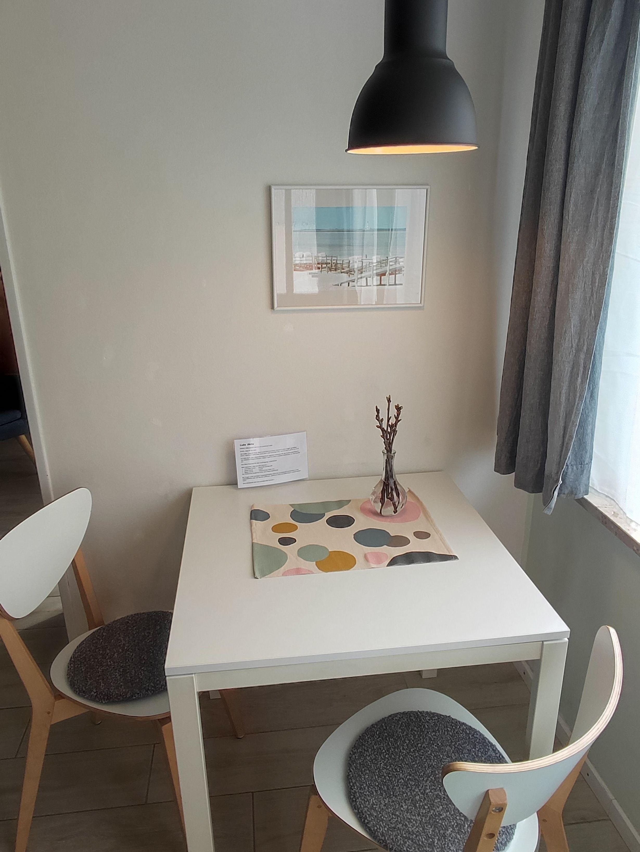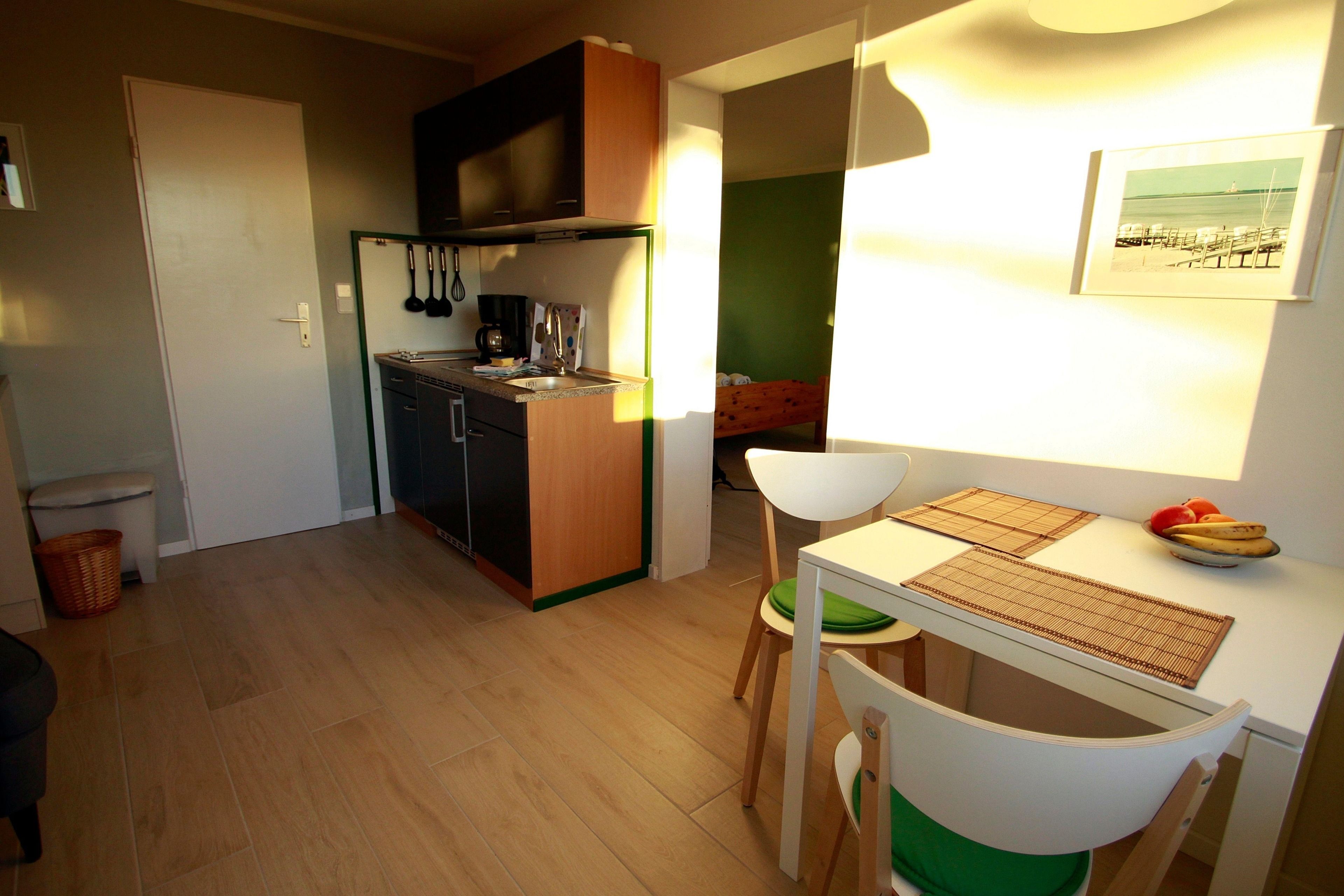 Die Ferienwohnung für zwei Personen ist aufgeteilt in eine Wohnküche mit angrenzendem Duschbad und einem Wohn- Schlafzimmer.