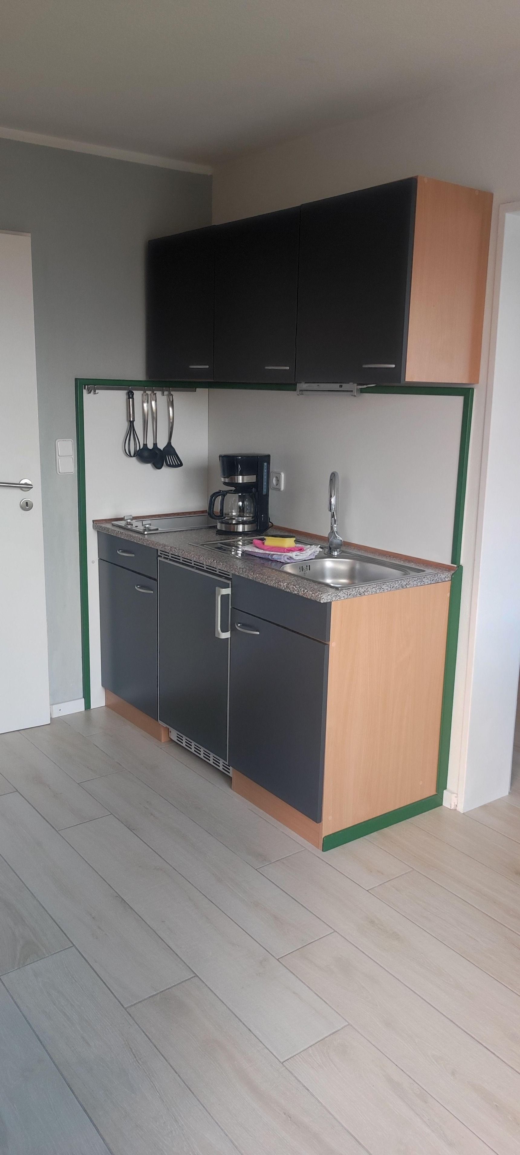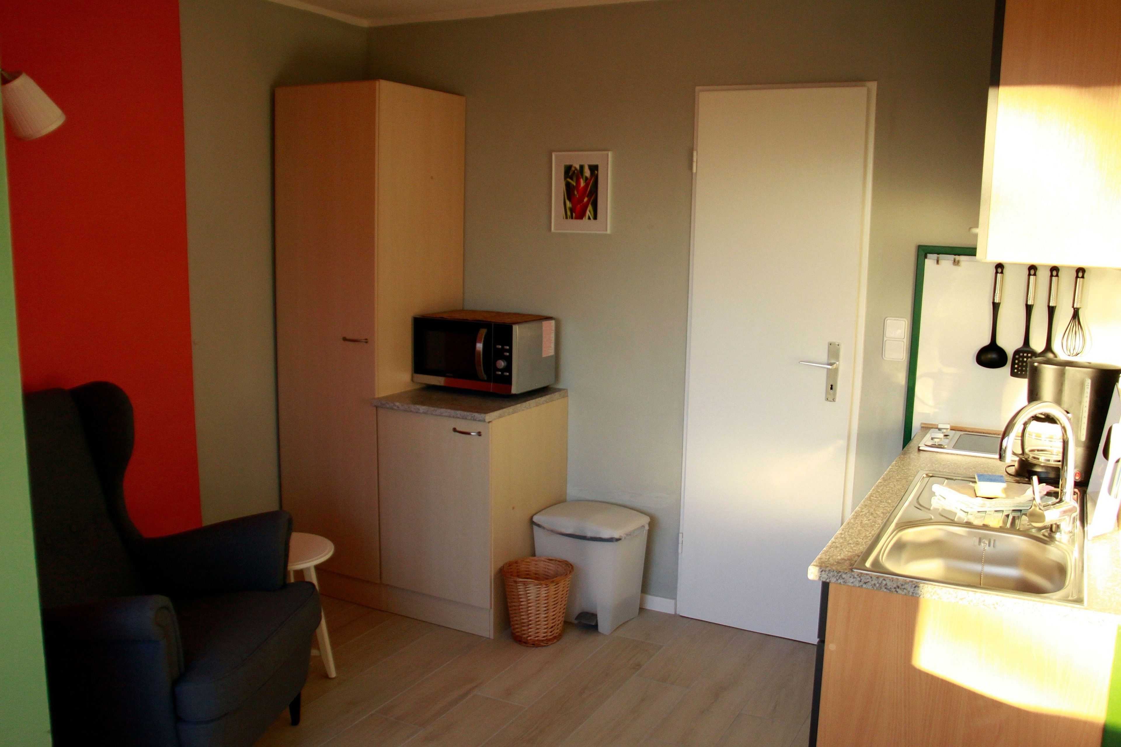 Die Küche ist ausgestattet mit einem 2-Platten-Herd, Kühlschrank mit Gefrierfach, Mikrowelle, Kaffeemaschine, Wasserkocher und ausreichend Geschirr.