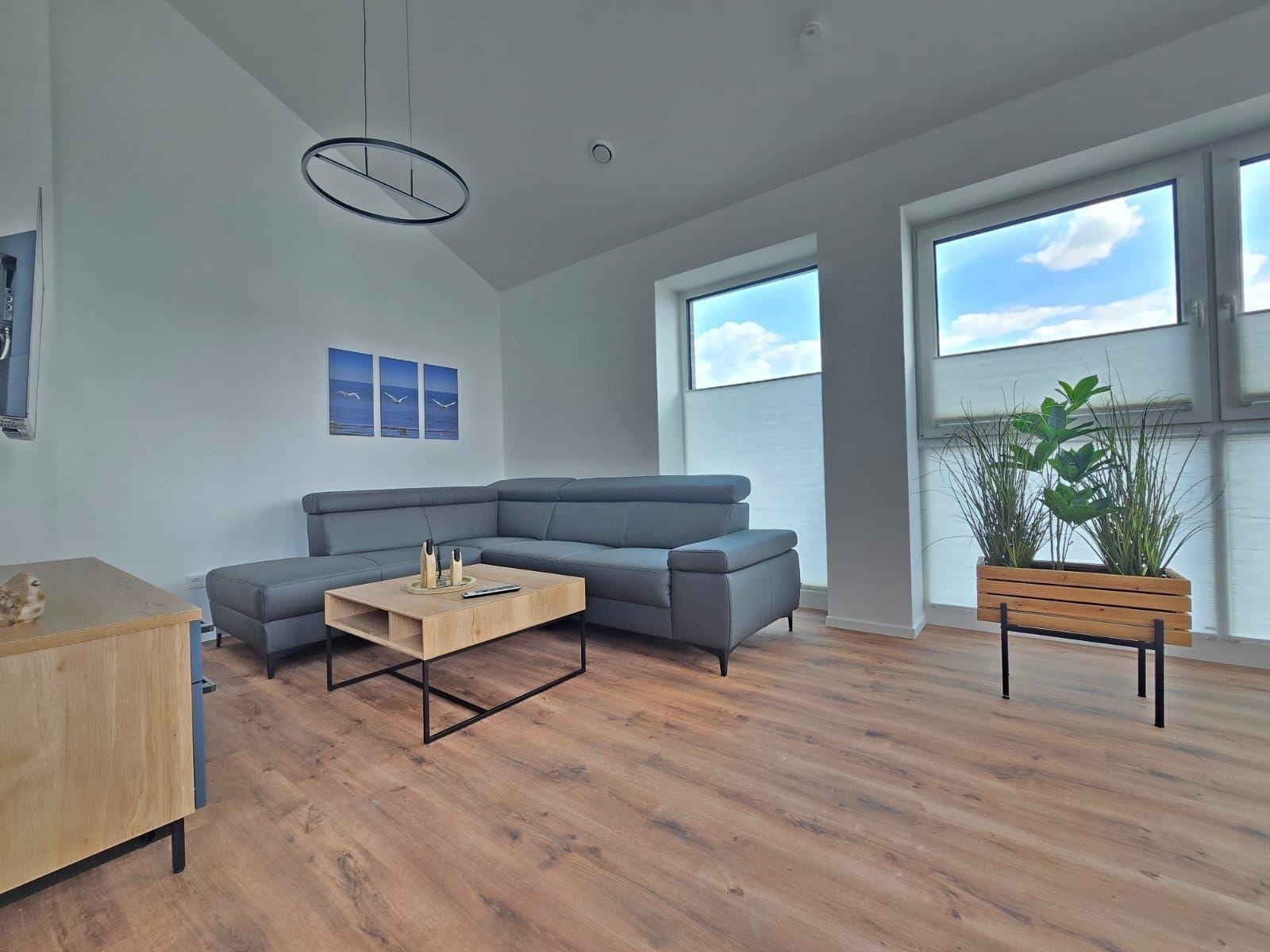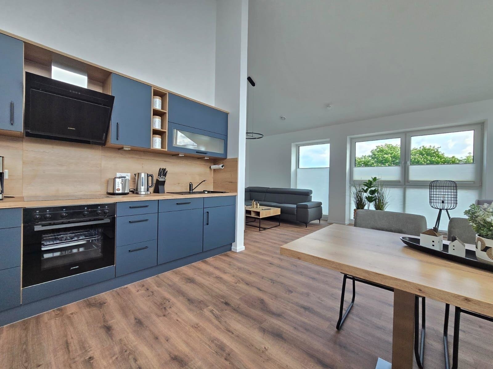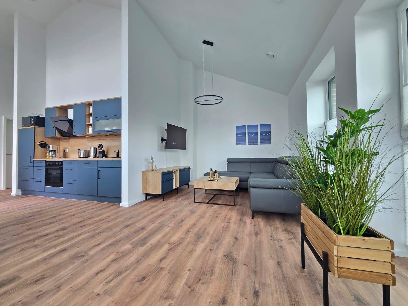 Die Ferienwohnung bietet einen modernen Rückzugsort mit durchdachter Ausstattung. Im offenen Wohnschlafzimmer befindet sich ein komfortables Doppelbett und eine Schlafcouch, die zusätzliche Schlafmöglichkeiten bietet. Die voll ausgestattete Küche verfügt über einen Elektro-/Gasherd, Backofen, Geschirrspüler, Kühlschrank, Mikrowelle sowie eine Kaffeemaschine und Toaster, um kulinarische Wünsche zu erfüllen. Ein Duschbad mit Haartrockner rundet die Badezimmerausstattung ab.