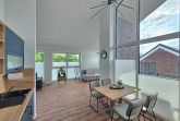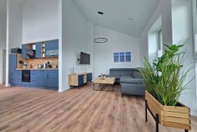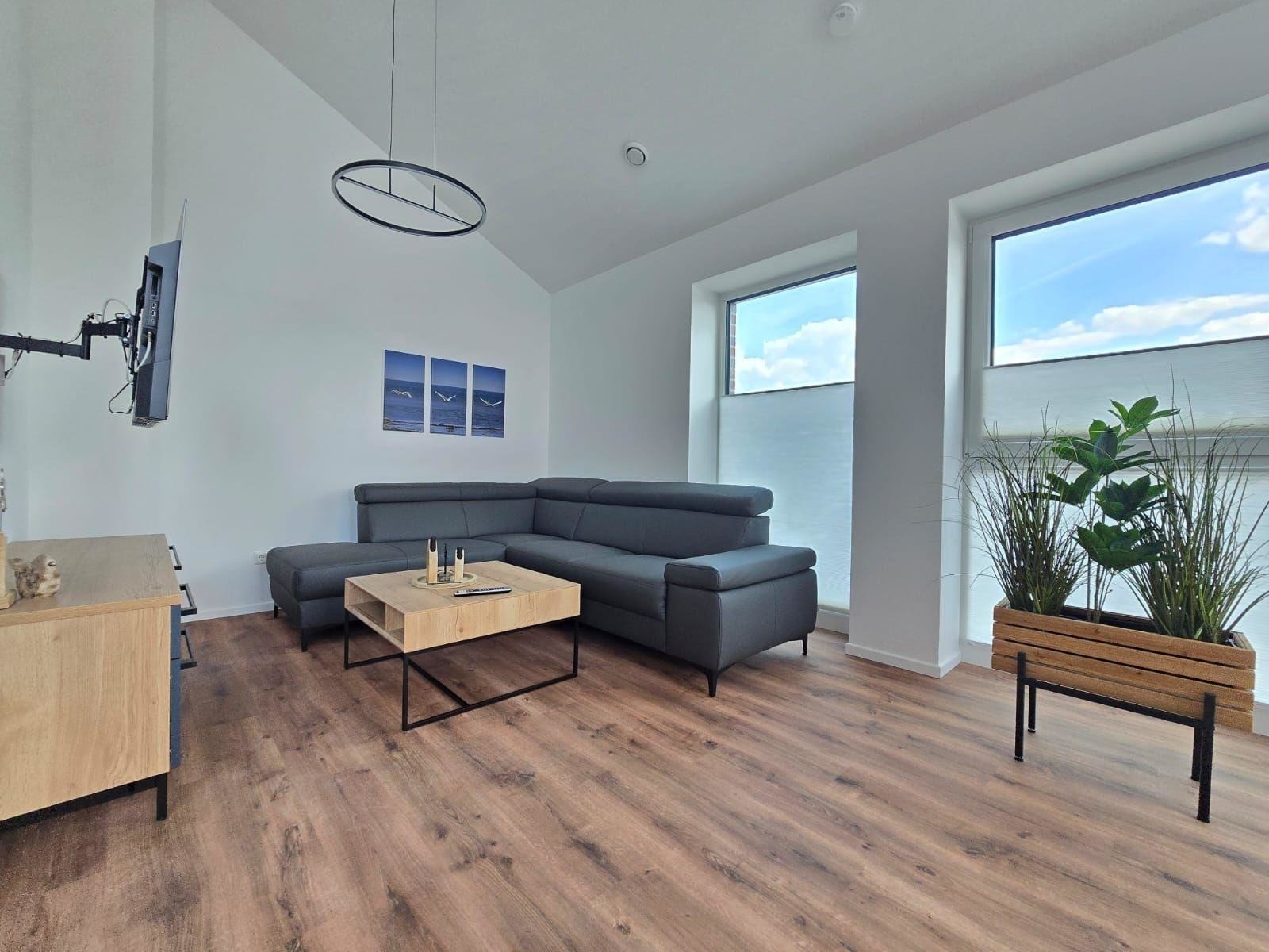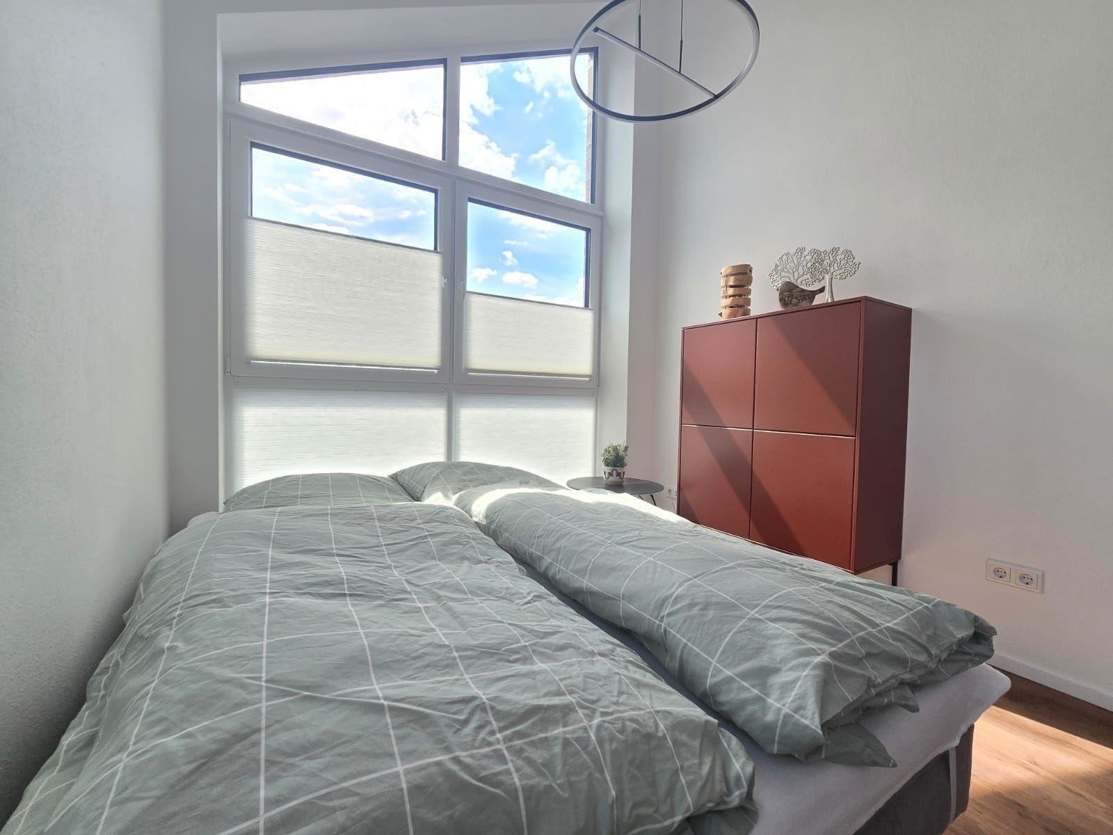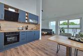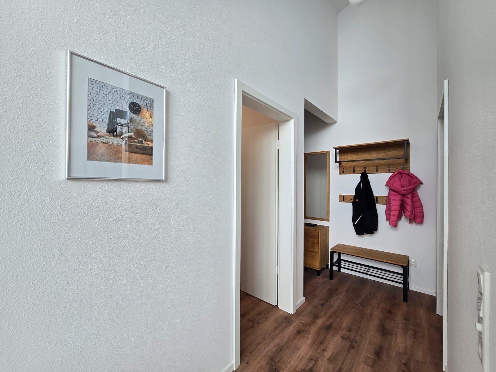Die Ferienwohnung bietet einen modernen Rückzugsort mit durchdachter Ausstattung. Im offenen Wohnschlafzimmer befindet sich ein komfortables Doppelbett und eine Schlafcouch, die zusätzliche Schlafmöglichkeiten bietet. Die voll ausgestattete Küche verfügt über einen Elektro-/Gasherd, Backofen, Geschirrspüler, Kühlschrank, Mikrowelle sowie eine Kaffeemaschine und Toaster, um kulinarische Wünsche zu erfüllen. Ein Duschbad mit Haartrockner rundet die Badezimmerausstattung ab.