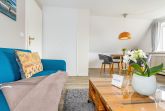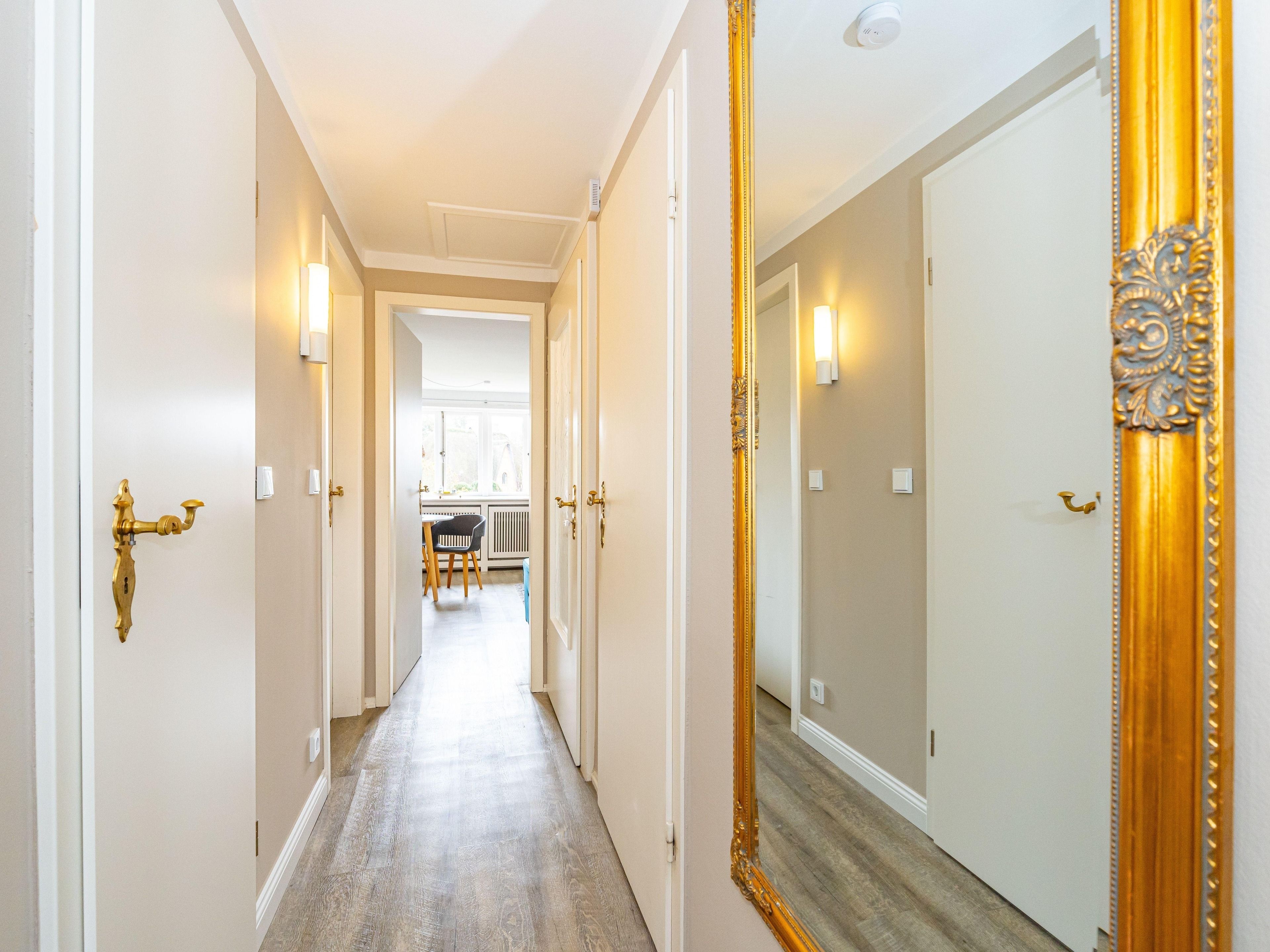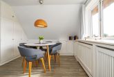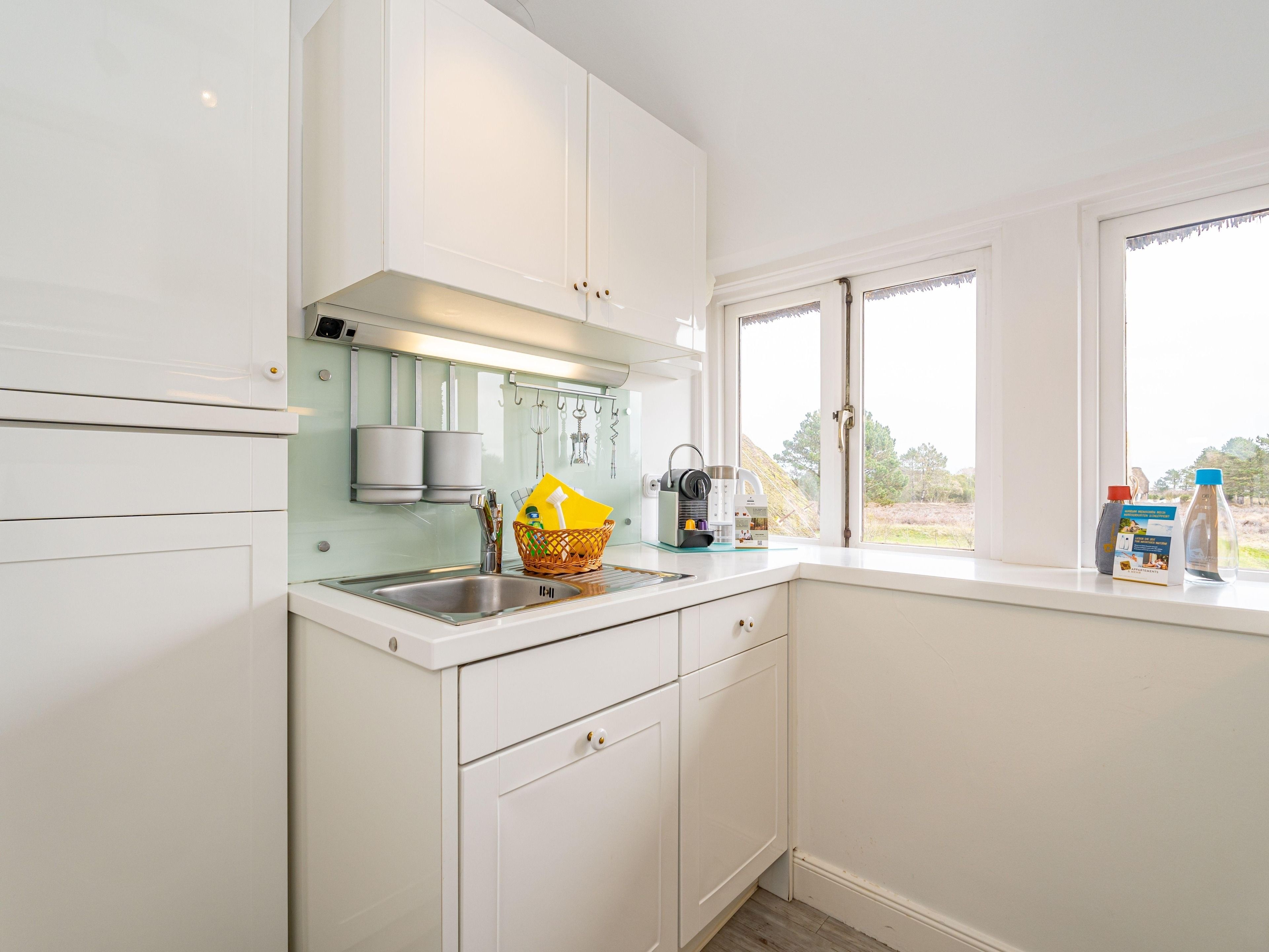 Wohnen in bester Lage und doch mitten in der Ruhe der Natur. Heideland, Wildblumenwiese und sogar ein kleiner Hühnerstall sorgen für ländliche Gemütlichkeit - fußläufig nach Kampen Mitte. Dieses Quartier für bis zu Drei liegt im 1. Obergeschoss eines klassischen Reetdachhauses, auch ein kleiner Vierbeiner hat hier Platz. Das gemütliche WohnEsszimmer begrüßt mit großer Fensterfront gen Süden und hat Platz für bis zu Vier am Esstisch. Die kleine Küche ist separat untergebracht und voll ausgestattet. Der erste Kaffee im Stehen lässt sich hier mit grandioser Aussicht über die auf dem Wattenmeer glitzernde Morgensonne genießen. Gleich nebenan ein frisch renoviertes, modernes Duschbad und gegenüber ein kleines Einzelschlafzimmer mit kuscheliger Schlafkoje. Das größere Doppelschlafzimmer liegt am Ende des Flures. Hier gibt es durch maßgeschneiderte Tischlereinbauten viel Stauraum und auch hier Natur pur - vom Bett aus kann man den Wind in den Baumwipfeln sehen. Die zugehörige Terrasse mit Strandkorb befindet sich direkt vor der Haustür und nach Westen ausgerichtet. Das Quartier ist mit Laminat ausgelegt.