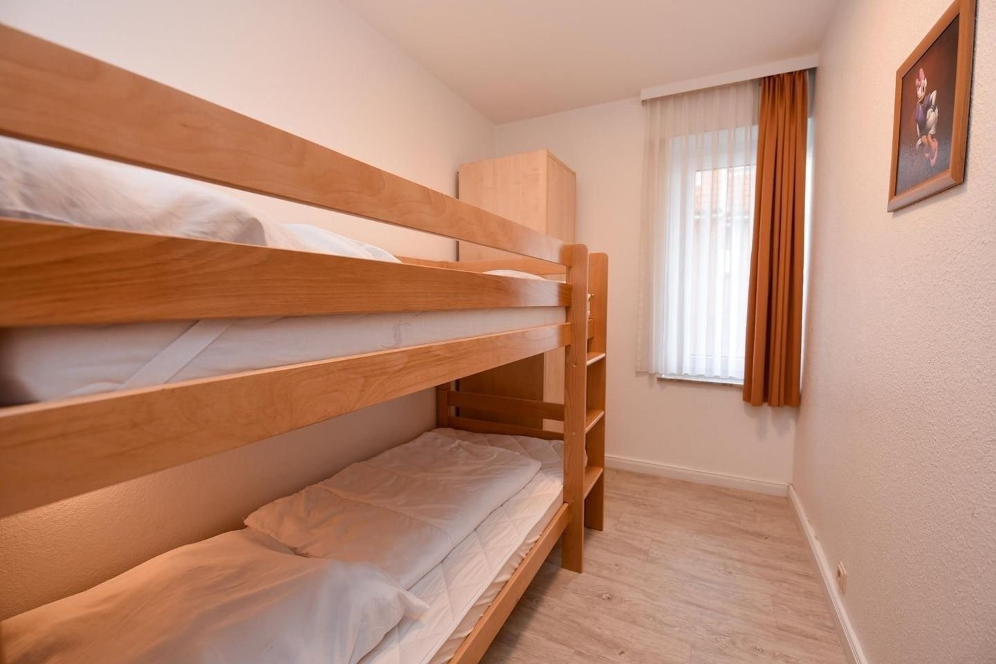 4-Zimmer Appartement im Haus Nige Wark. Elternschlafzimmer mit Doppelbett und zwei Kinderzimmer mit jeweils einem Etagenbett. Geräumiges Wohnzimmer mit 2 Zweisitzer-Sofa, Flachbild-Tv und integrierter Küchenzeile die u.a. mit Spülmaschine, Mikrowelle und Kühlschrank mit Gefrierfach ausgestattet ist . Badezimmer mit Dusche und WC. Größe ca. 48qm. Erdgeschoss mit Terrasse zur Seeseite.