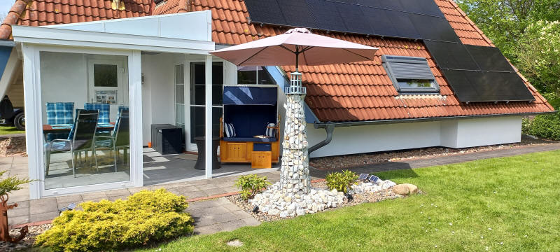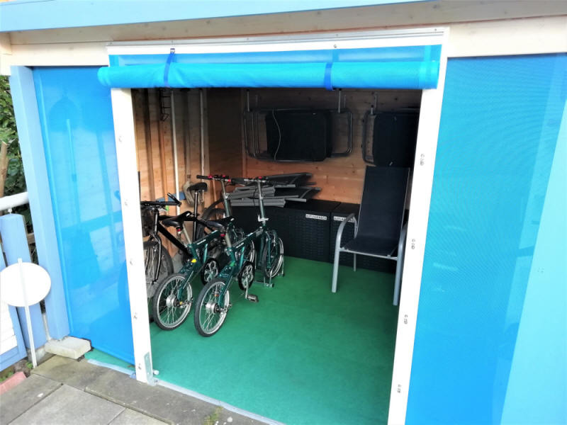 Auf der überdachten und windgeschützten Terrasse stehen Gartenmöbel und ein Strandkorb auf Rollen. Zusätzliche Stühle, Polster, Liegen, ein Weber-Kugelgrill und ** 2 Klappräder ( Nutzung auf eigene Gefahr ) ** stehen im linken Teil des Gartenhauses zur Nutzung bereit. Hier ist auch Platz für mitgebrachte Fahrräder.