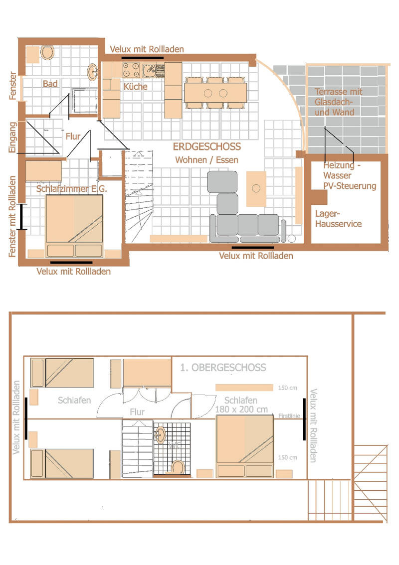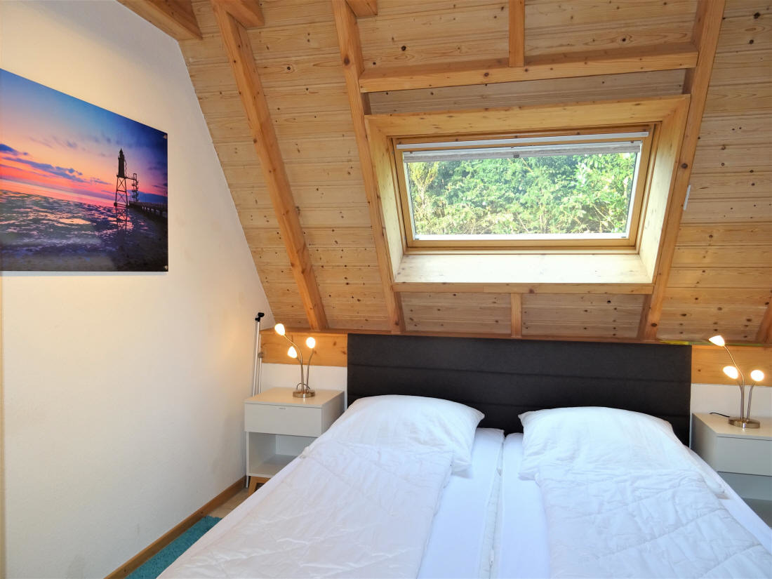 Im Obergeschoss befinden sich 2 weitere Schlafzimmer mit einem Doppelbett ( 160x200 cm) und SAT-TV, im
