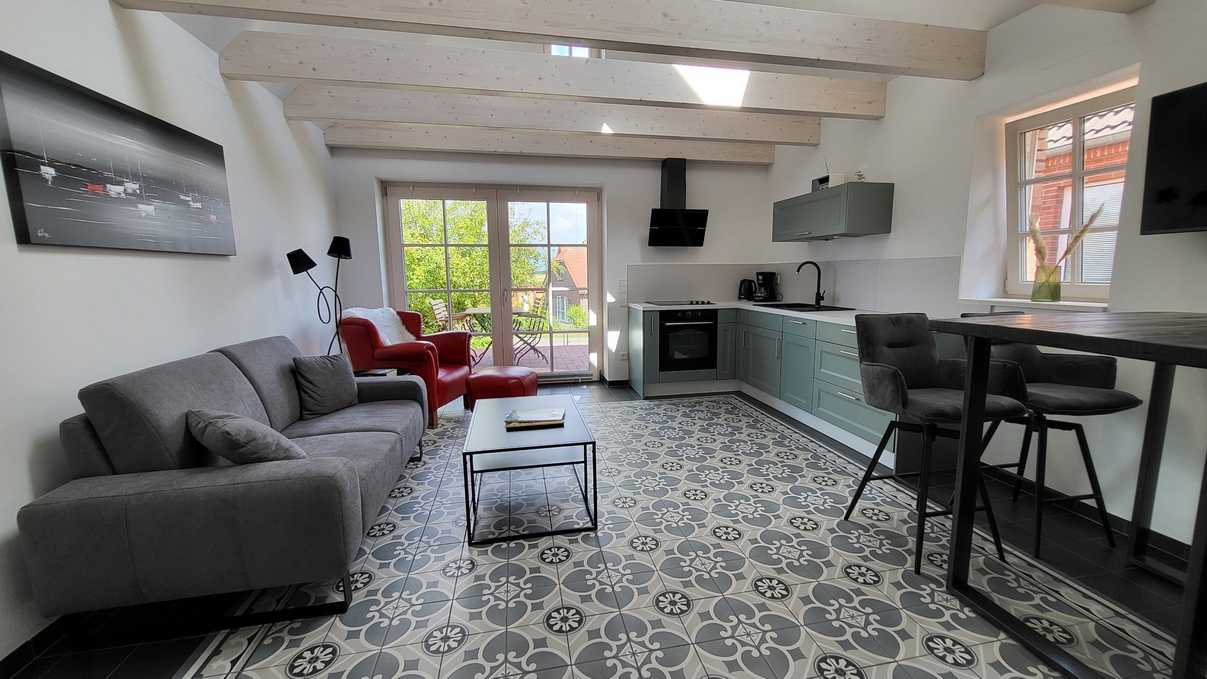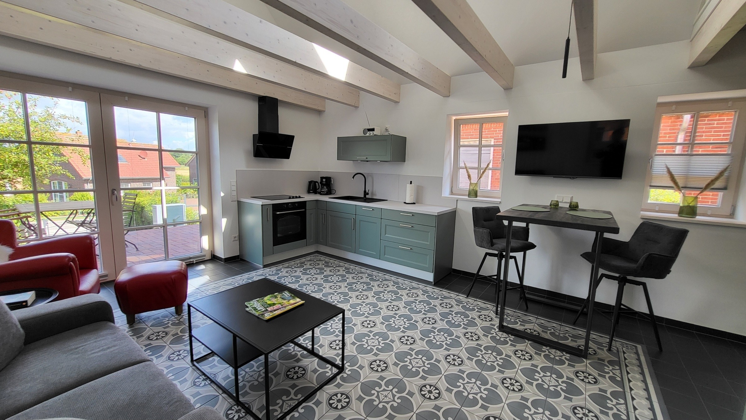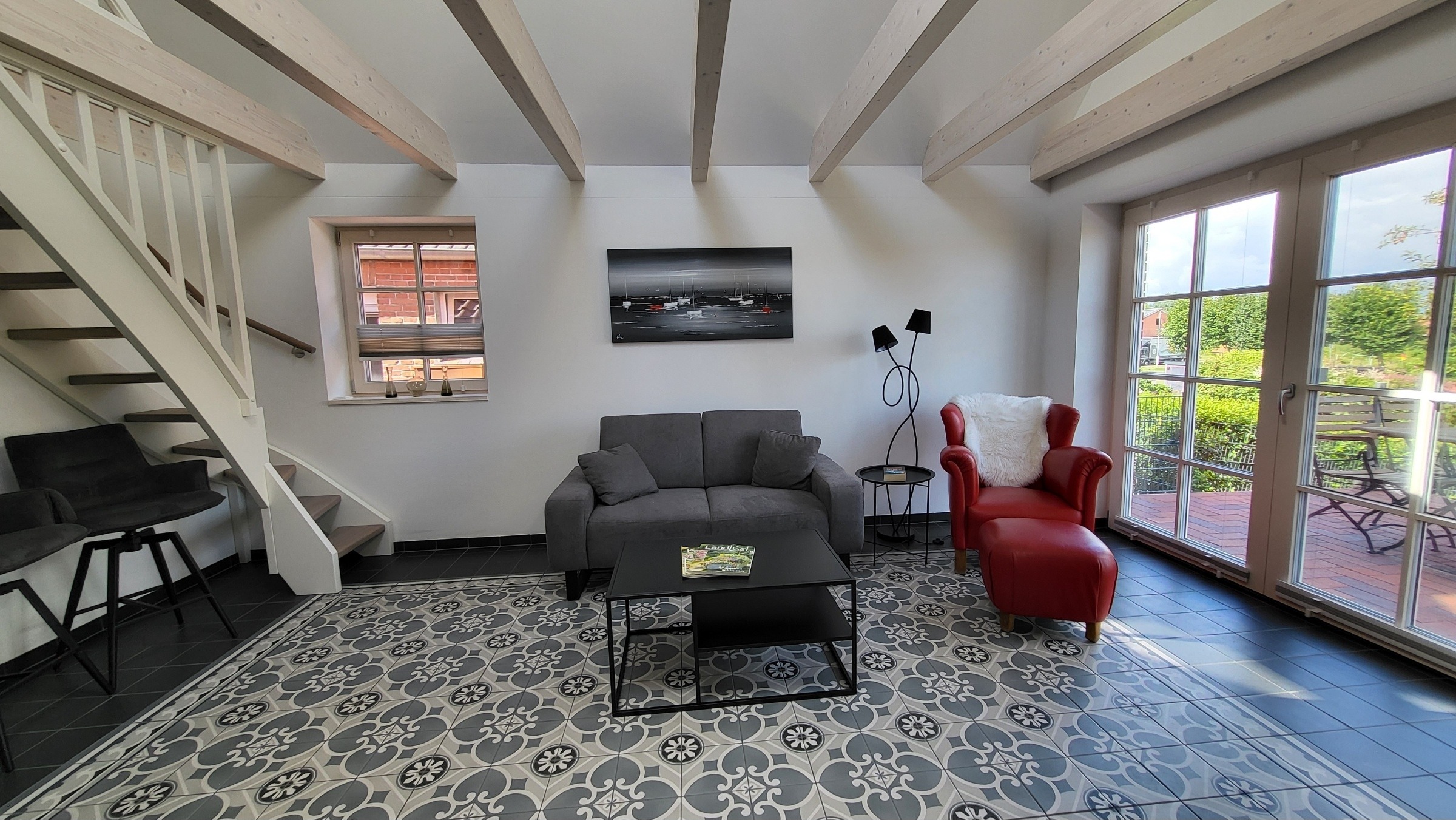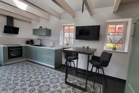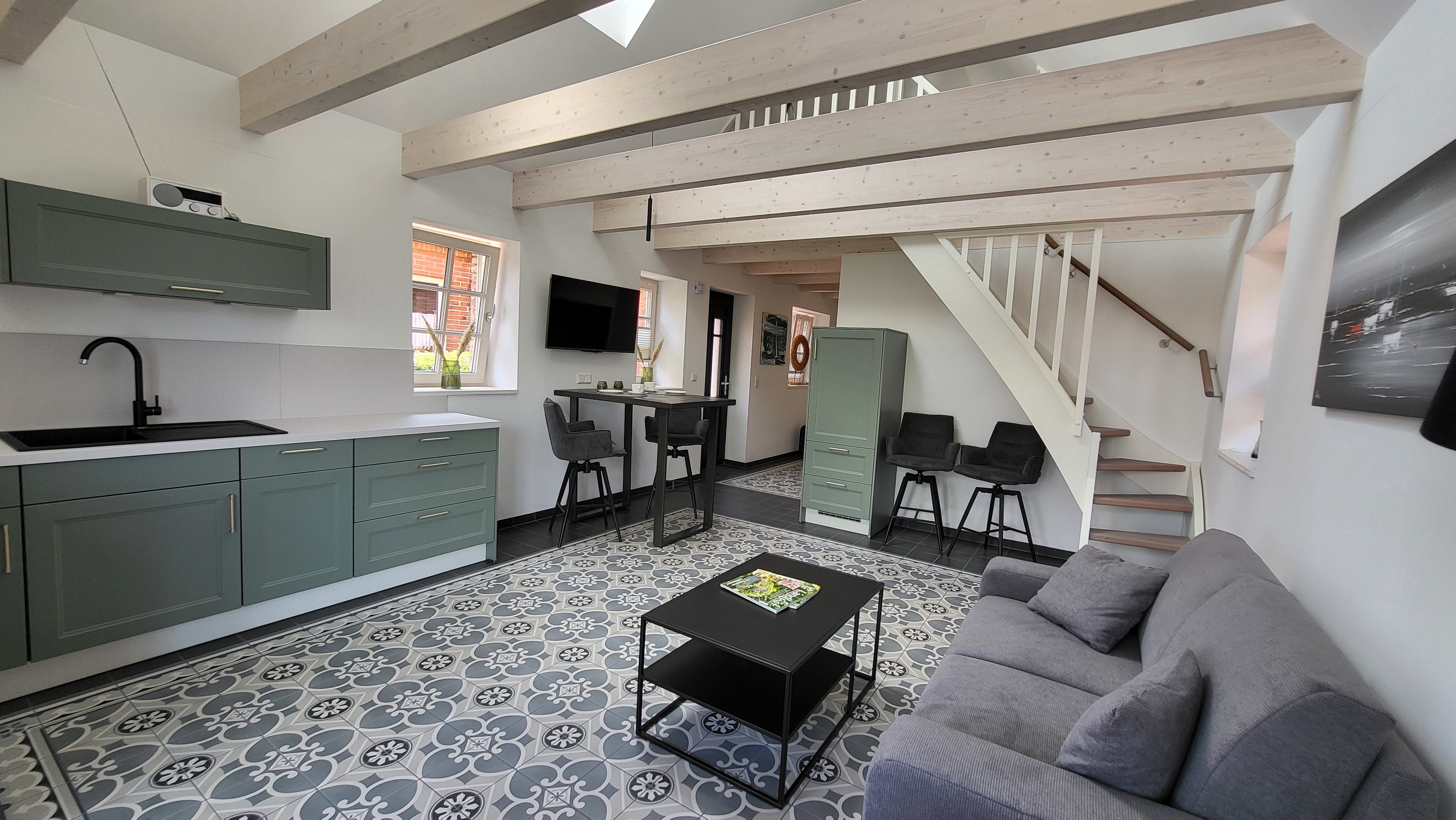 Die moderne und liebevolle Einrichtung erfüllt auch höchste Ansprüche. Die 55qm² Wohnfläche sind aufgeteilt in Wohnzimmer mit einer Sitzbar und komplett ausgestatteter Küche, Flur, Badezimmer mit ebenerdiger Walk-In Dusche, Handtuchwärmer, 1 Schlafzimmer unten mit einem Bockspringbett 180X200m, einer Galerie mit 2 Einzelbetten.