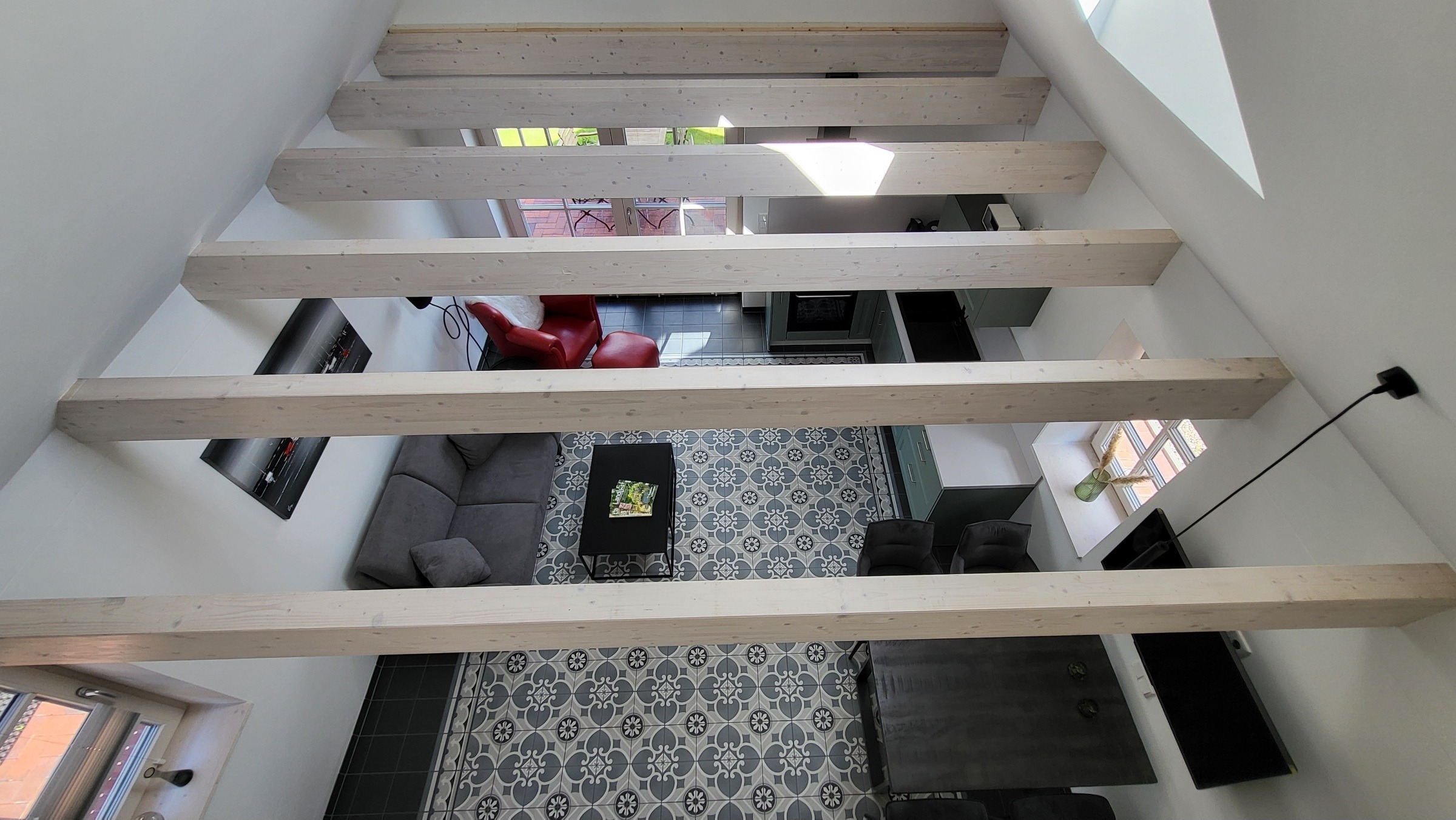 Lichtdurchfluteter Wohnraum mit offenem Blick in den Giebel mit exlusiven Wohnkomfort, Fußbodenheizung mit Wärmepumpe, ebenerdiger Dusche. Terrasse mit einer gemütlichen Lounge Sitzgruppe zum genießen. Zwei Seitenmarkisen sind als idealer Windschutz vorhanden.