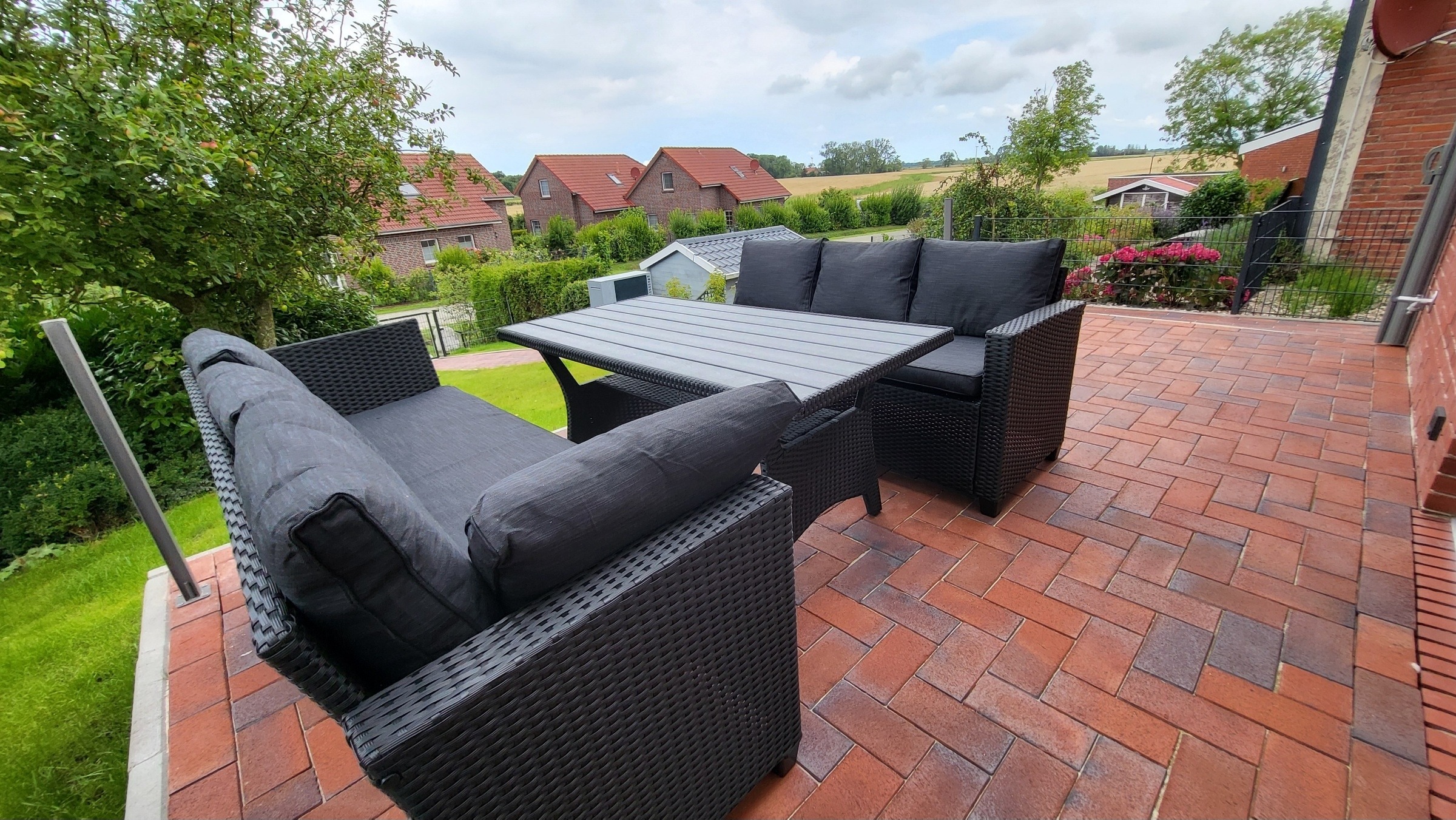 Die Terasse befindetet sich in einem eingezäunten Garten mit einer Lounge Sitzgruppe und angrenzendem Parkplatz.