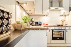 Bosch-Küche mit Herd/Backofen und Mikrowelle, Kühlschrank mit Gefrierfach und Geschirrspülmaschine mit Hoch-Esstisch für bis zu 6 Personen.