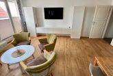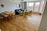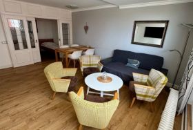 Der Wohnbereich ist mit einer Essecke, einer Couch mit Sessel, TV und WLAN. Vom Wohnbereich haben Sie Zugang zum Balkon, von dem Sie einen tollen Ausblick auf das Wattenmeer, das Vogelschutzgebiet und die Insel Neuwerk genießen.