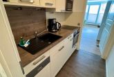 Von der separaten Küche, die mit einem Kühlschrank, einem Backofen mit Ceranfeld, einem Geschirrspüler, einer Mikrowelle sowie einer Kaffeemaschine, einem Toaster und einem Wasserkocher ausgestattet ist, gelangen Sie sowohl zum modernen Duschbad als auch in den Wohnbereich.