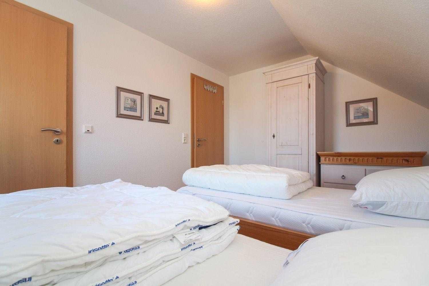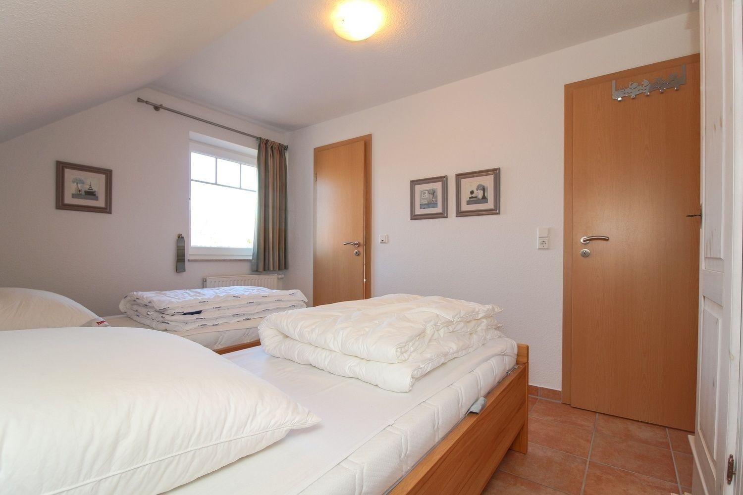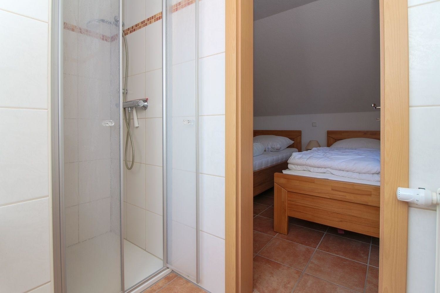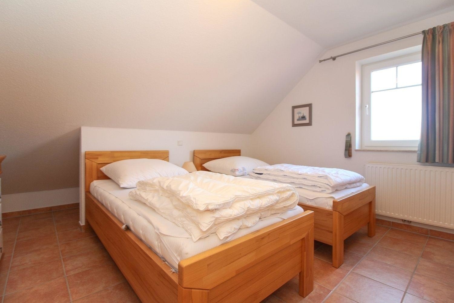 Im Erdgeschoss befindet sich ein Schlafzimmer mit Doppelbett, Kleiderschrank und Kommode und angrenzendem Duschbad mit Handtuchheizkörper, WC und Urinal. Im Obergeschoss mit offener Galerie finden Sie ein weiteres Schlafzimmer mit zwei Einzelbetten sowie einem zweiten Duschbad mit WC. Ideal für Urlaub mit der Familie oder mit guten Freunden.