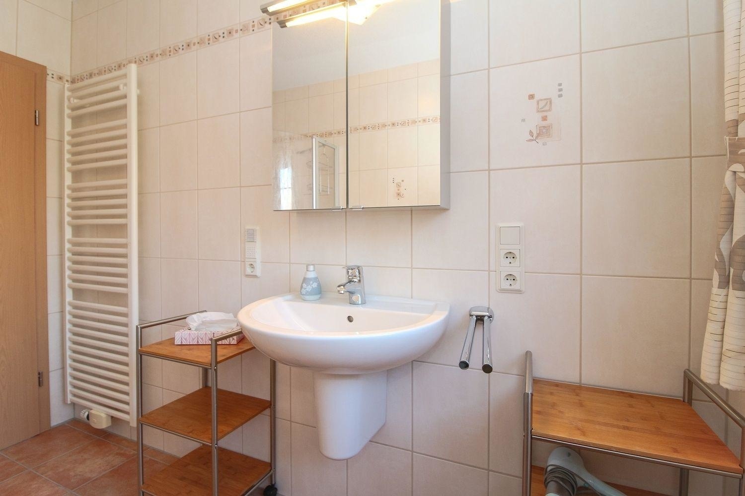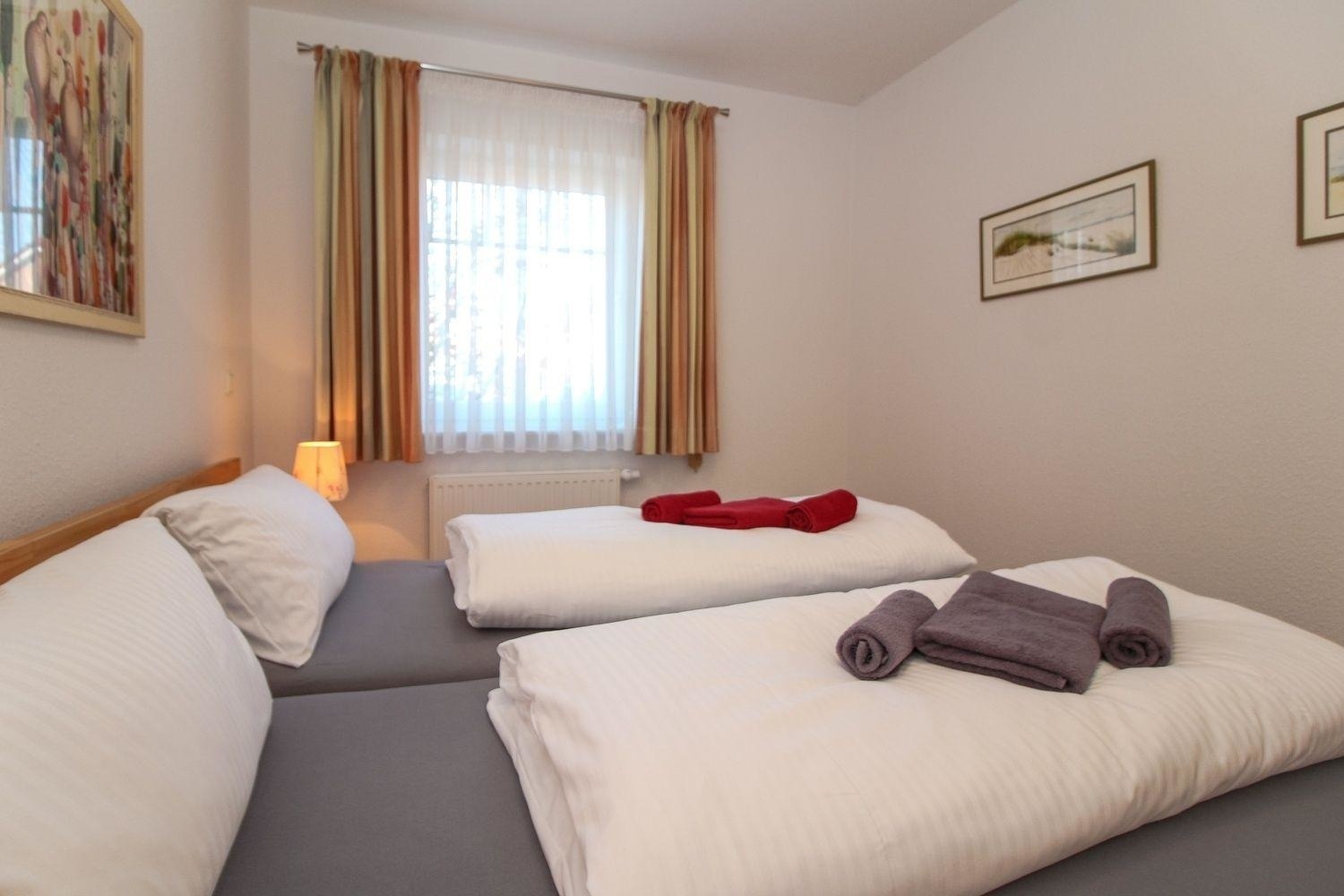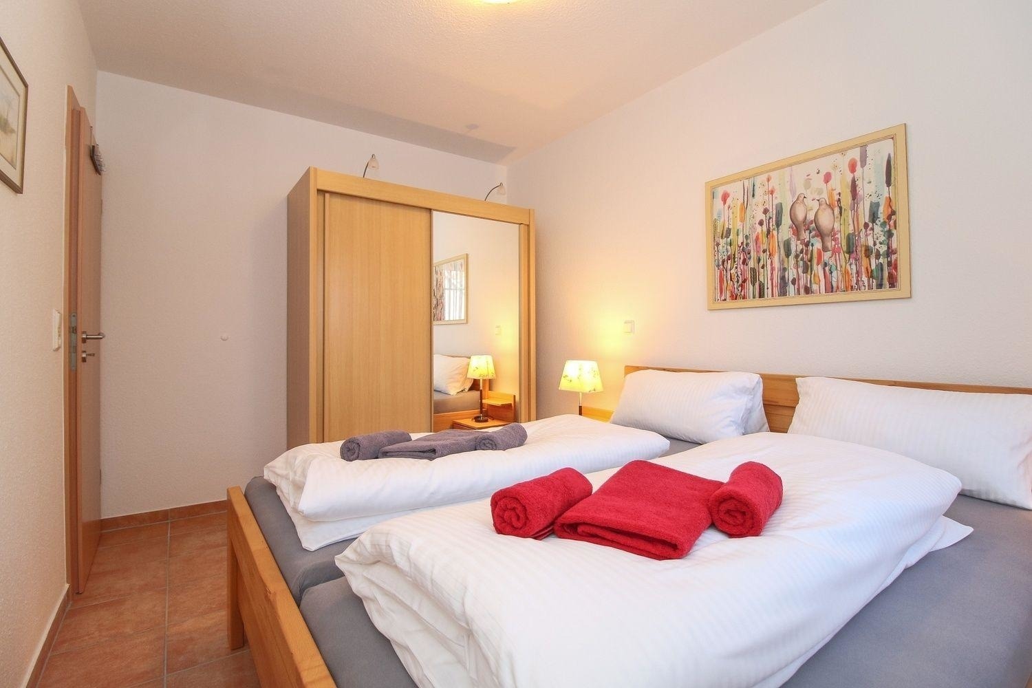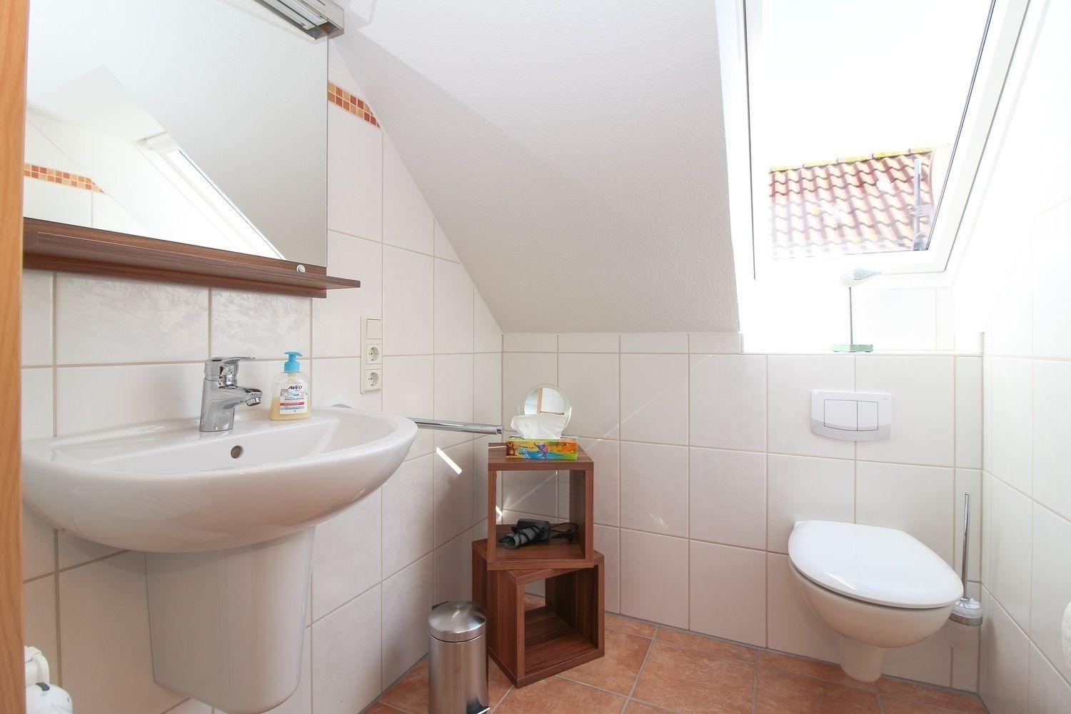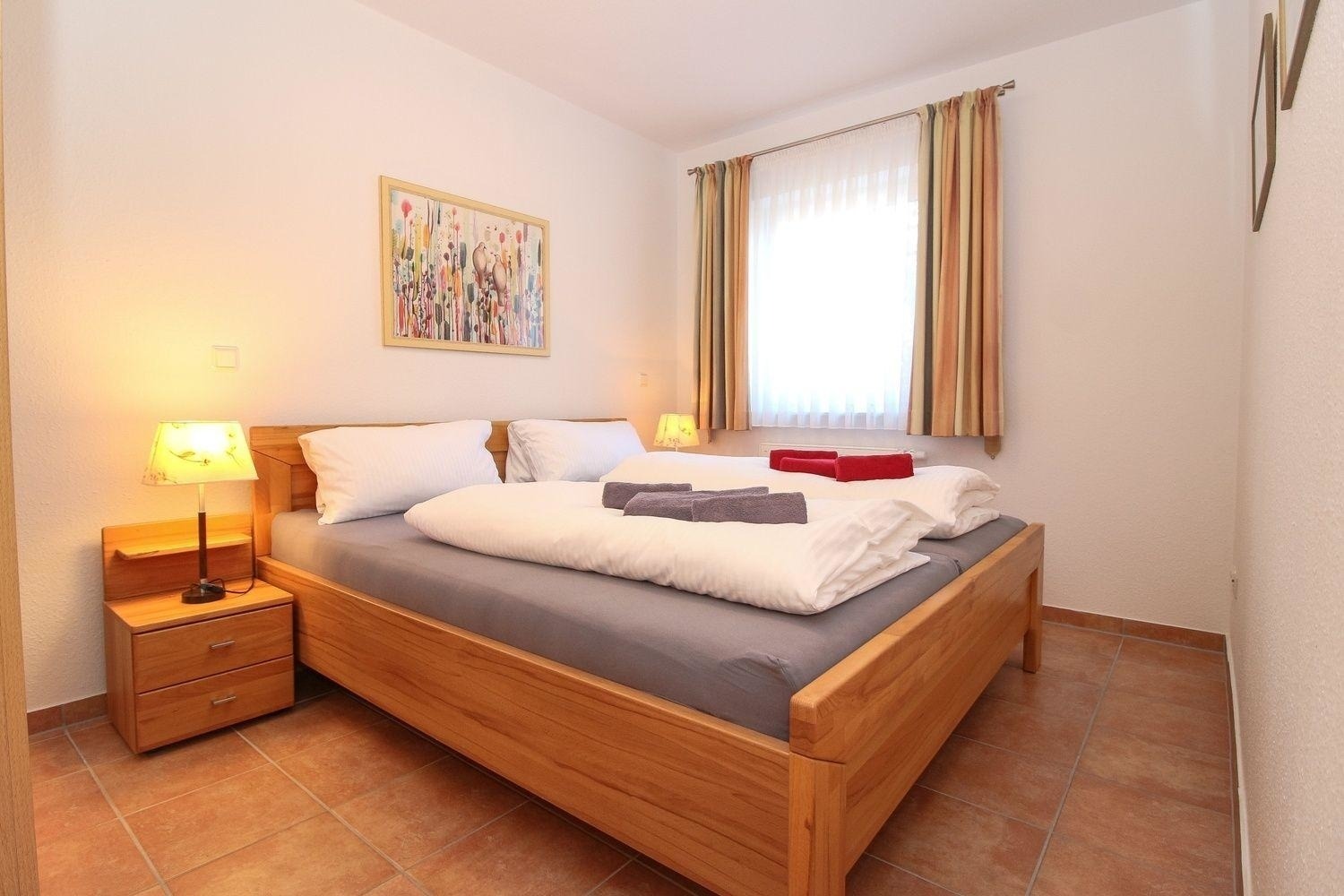Im Erdgeschoss befindet sich ein Schlafzimmer mit Doppelbett, Kleiderschrank und Kommode und angrenzendem Duschbad mit Handtuchheizkörper, WC und Urinal. Im Obergeschoss mit offener Galerie finden Sie ein weiteres Schlafzimmer mit zwei Einzelbetten sowie einem zweiten Duschbad mit WC. Ideal für Urlaub mit der Familie oder mit guten Freunden.
