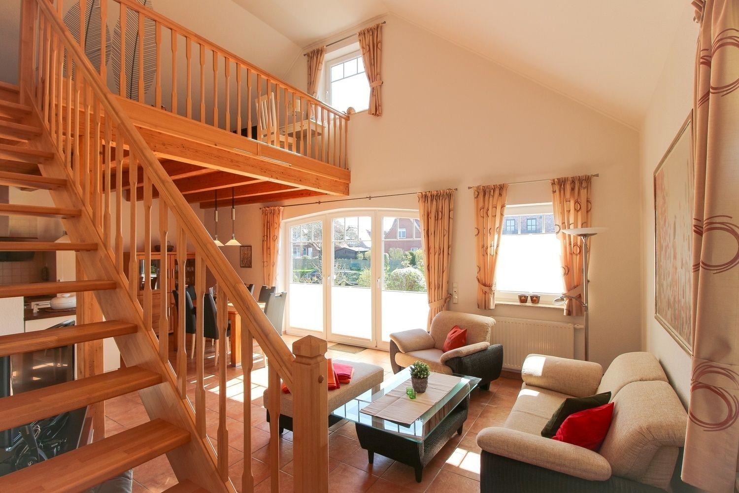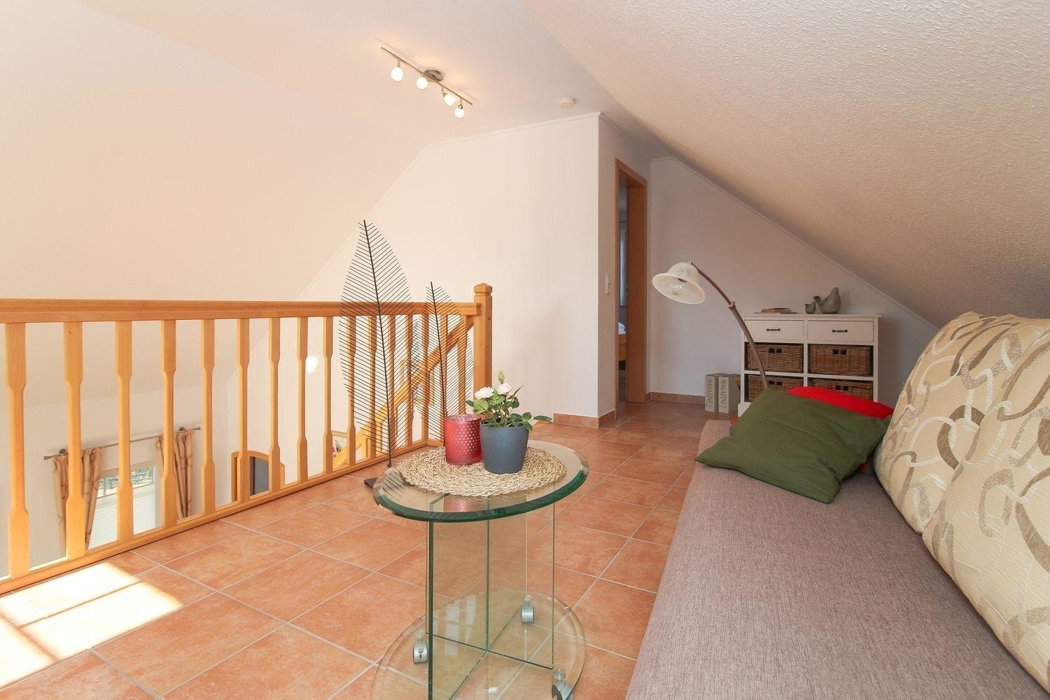 Ziehen Sie sich auf die offene Galerie mit gemütlicher Sitzgelegenheit zurück und lassen Sie Ihre Seele baumeln. Ein zweites SAT-TV steht hier für Sie bereit, oder stöbern Sie in den Ostfriesland-Heften und den bereitliegenden Büchern.