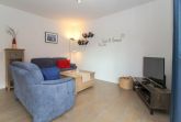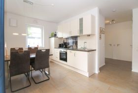 Im Wohn-/Essbereich befindet sich eine sehr gut ausgestattete Küchenzeile. Im geräumigen Schlafzimmer steht ein sehr komfortables Boxspringbett, bei dem die Liegefläche jeweils separat (Kopf/Fuß, links/rechts) elektrisch angehoben oder abgesenkt werden kann.