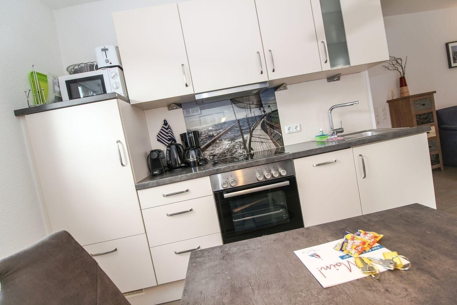 Eine Erstausstattung (Spülmaschinentab, WC-Papier, kl. Flasche Spülmittel, Spültuch und Topfschwamm) ist vorhanden.