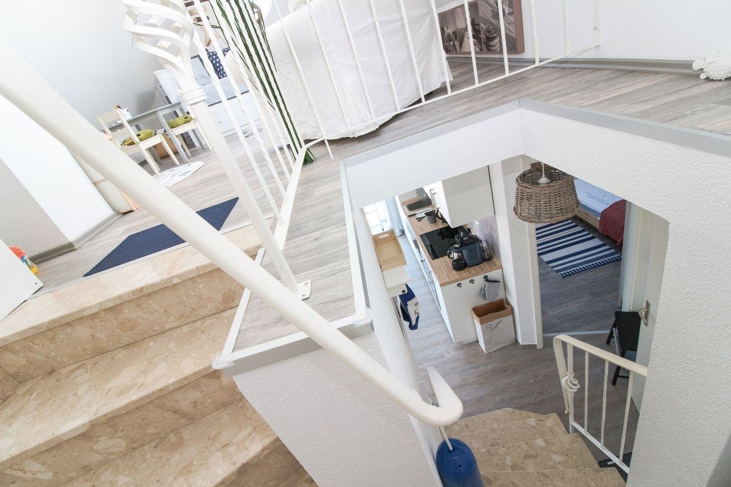 Sie erstreckt sich über 2 Ebenen mit zwei Schlafräumen, einem Wohn-und Essbereich, einer Einbauküche und einem Bad.