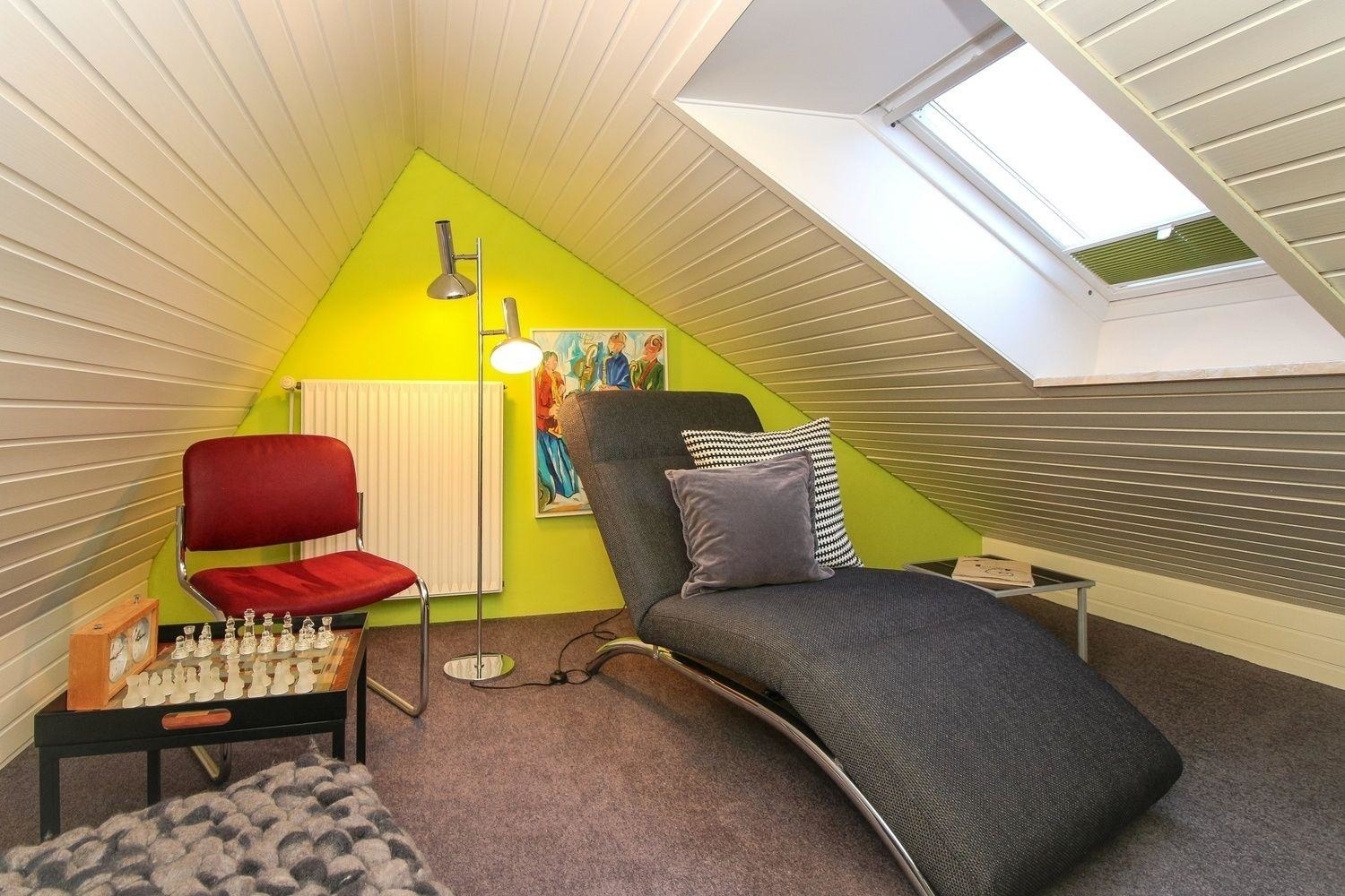 Im Dachgeschoss des Ferienhauses lädt ein kleines Lese- und Musikzimmer mit einer gemütlichen Sitzgelegenheit und einer hochwertigen HiFi Stereoanlage zum Relaxen ein.