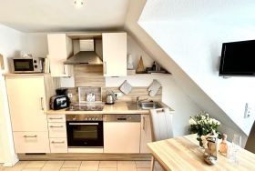 Unsere lichtdurchflutete Wohnung bietet Ihnen viele Annehmlichkeiten damit Sie sich vom ersten Moment an Ihren Urlaub genießen können. Der lichtdurchströmte und freundliche Wohnraum lädt zum Wohlfühlen ein. Auf der gemütlichen Couch können Sie perfekt entspannen. In der gut ausgestatteten Küche mit neuer Spülmaschine steht der Selbstversorgung nichts im Wege. Im sehr ruhigen Schlafzimmer gibt es ein Doppelbett mit neuen Matratzen sowie einen Kleiderschrank und eine Kommode, ein Flachbild-TV befindet sich sowohl im Schlafzimmer als auch im Wohnraum.