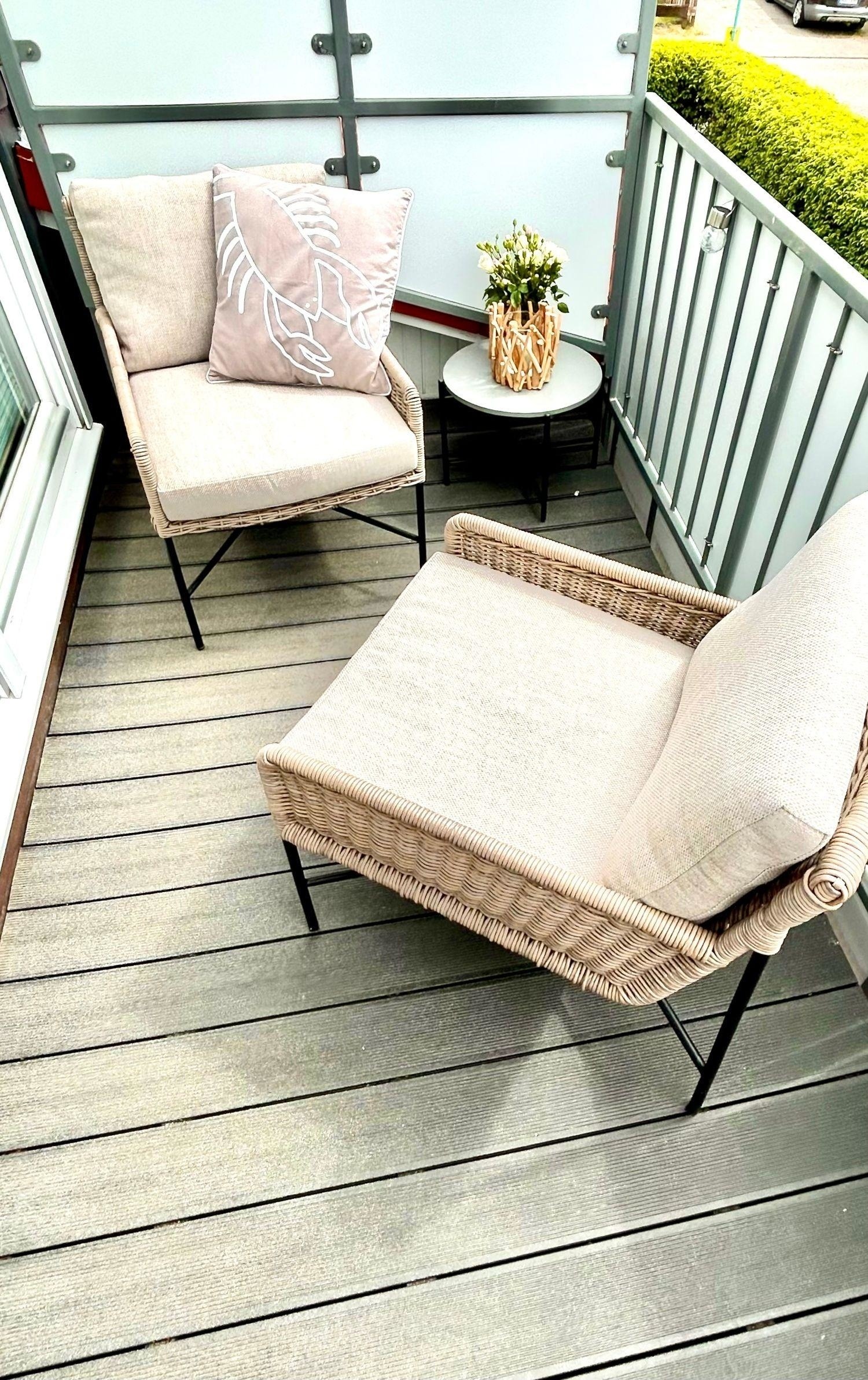 Auf dem süd-westlich ausgerichteten Balkon können Sie den ganzen Tag die Sonne genießen. Für pure Entspannung warten moderne, gemütliche Loungemöbel und ein Sonnenschirm bereits auf Sie.