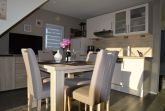 Beim Eintreten in die Wohnung gelangen Sie in die modern eingerichtete Wohnküche, welche in grauen, vanillefarbenen und hellbraunen Farbtönen gehalten ist.