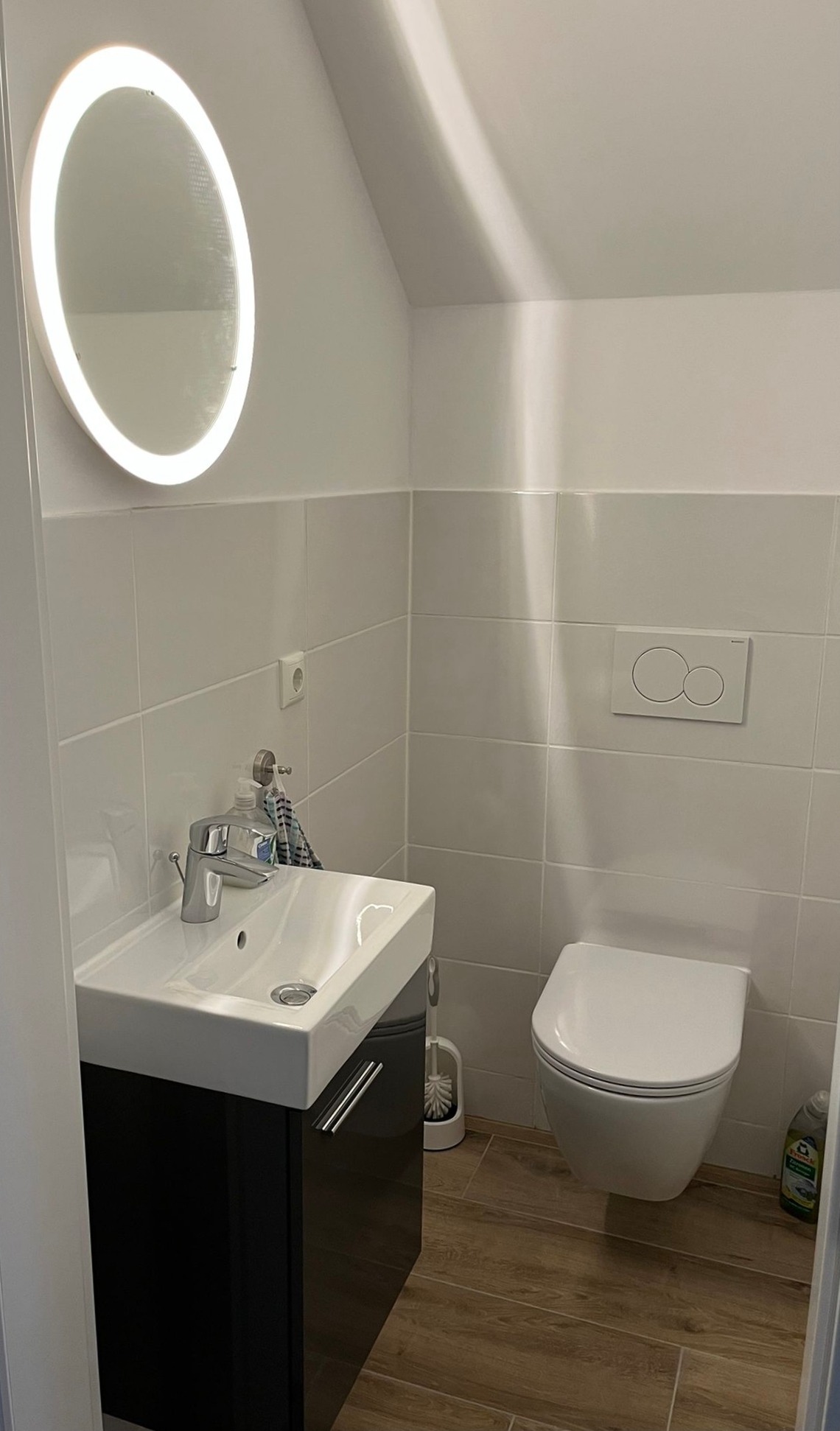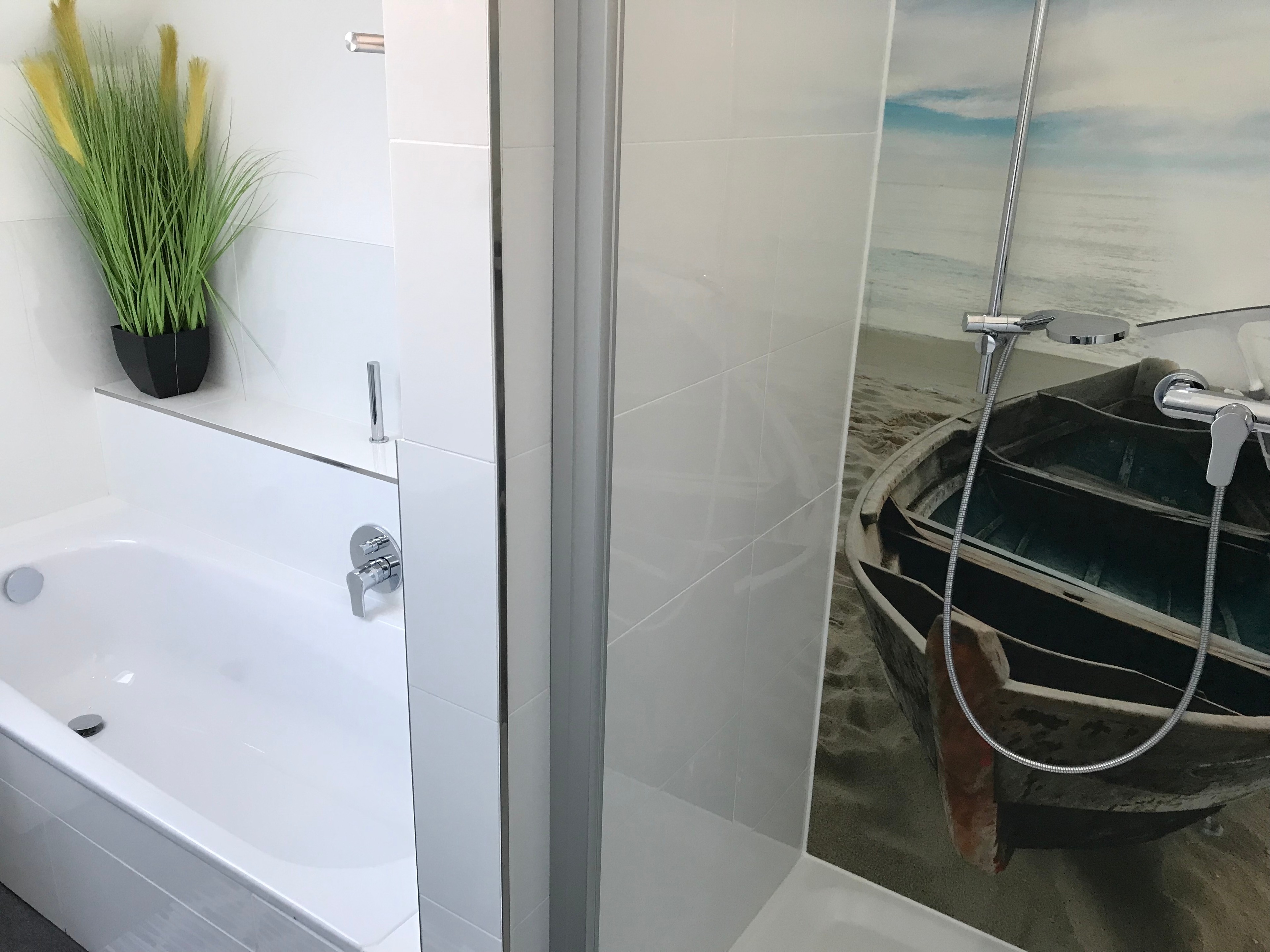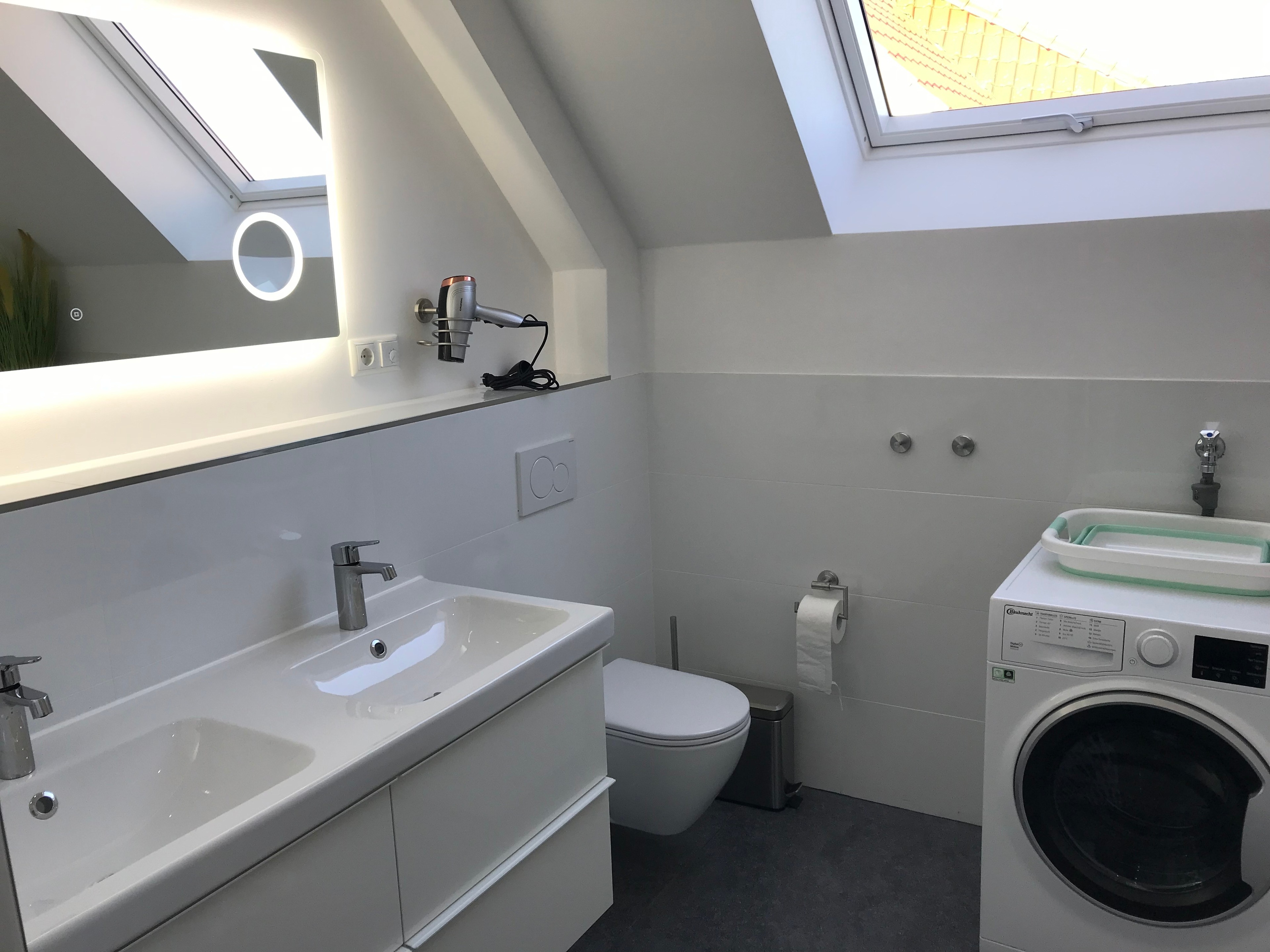 Das Tageslicht-Bad verfügt über Doppelwaschplatz, große Dusche, Badewanne und Waschtrockner.