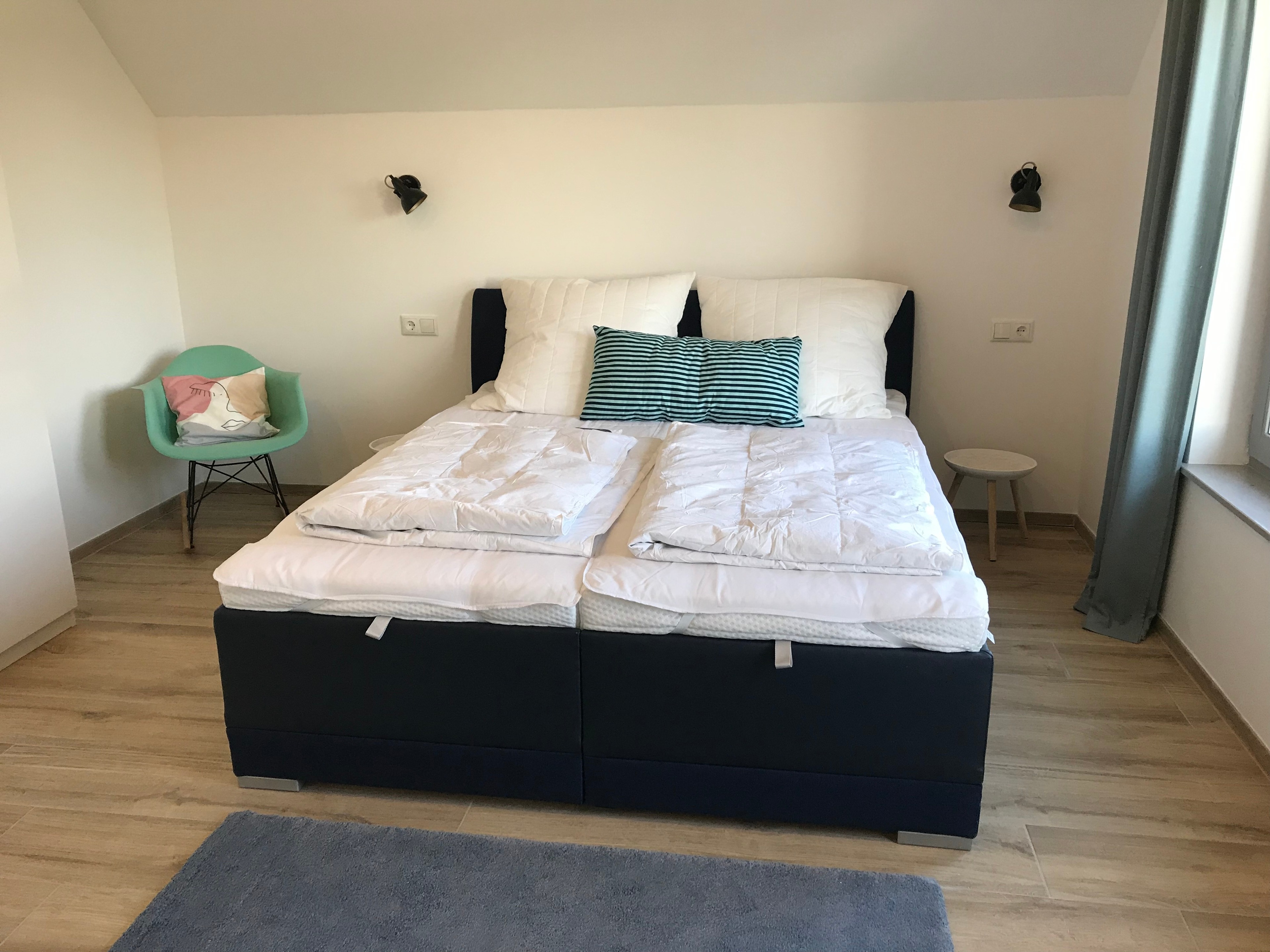 OG: 1 Einschlafzimmer mit Doppelbett 160x200 (2x80x200) mit Platz für ein mitgebrachtes Babybett.