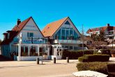 Vor der Ferienwohnung in Richtung Strandallee/Promenade befindet sich eine Terrasse mit Sitzmöbeln und einem Strandkorb.