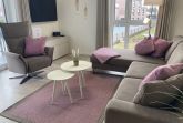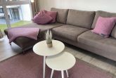 • modernes geschmackvoll eingerichtetes Wohnzimmer mit Lounge-Sofa, Lowboard, Relax-Sessel, 50-Zoll Smart-TV, Vorhängen und Musik über Bluetooth
