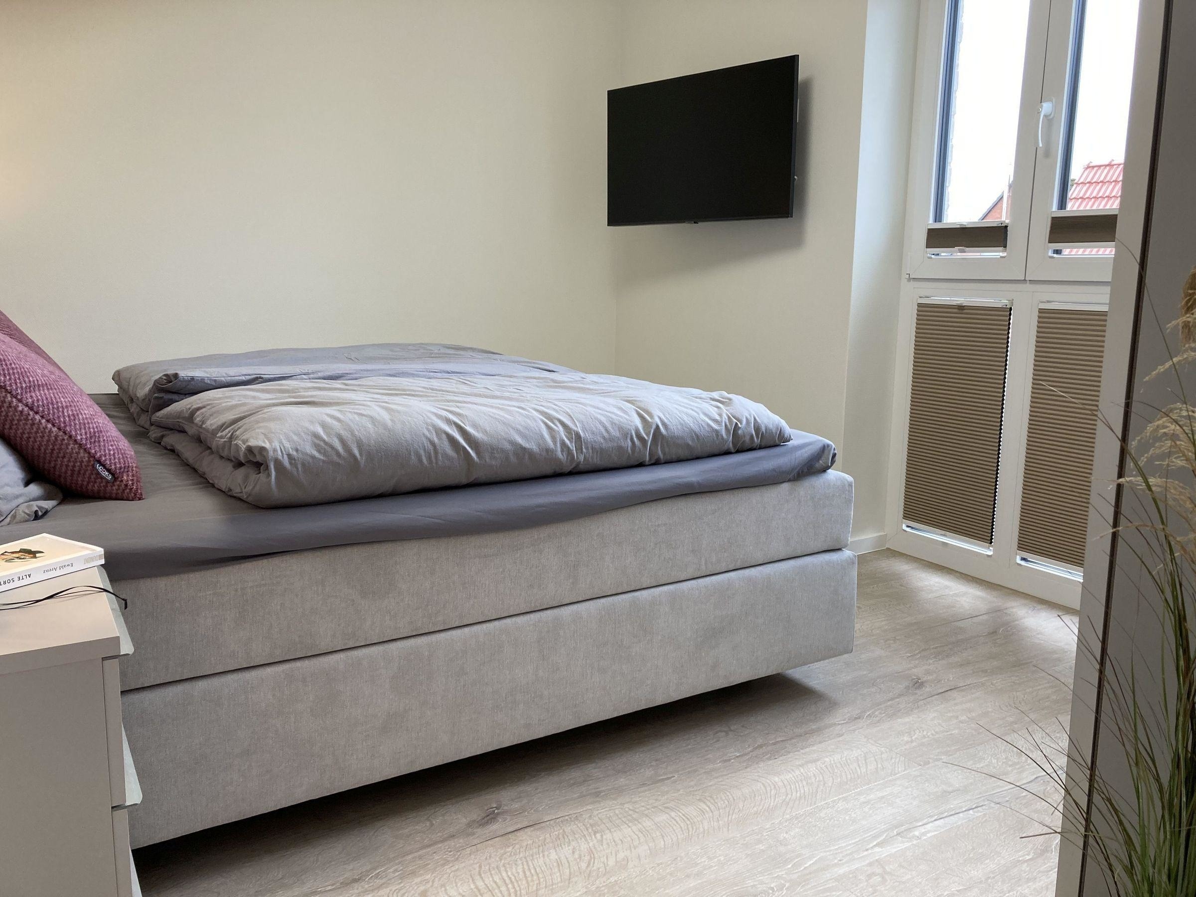 Schlafzimmer 1: Hochwertiges Boxspring-Bett mit durchgängiger Matratze (180 cm x 200 cm) in Härtegrad 2, Verdunklungsrollos, Kleiderschrank und 43-Zoll Smart-TV