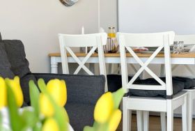 Die modernisierte 36m² Wohnung befindet sich in der ersten Etage im Haus A der Anlage Bellevue. Der sonnige Wohnbereich verfügt über eine gemütliche Sofaecke (Schlafsofa ca. 160*200 cm) und einen Flatscreen-TV. Das separate Schlafzimmer verfügt über zwei weitere Schlafplätze (zwei Einzelbetten ca. 90*190 cm). Beide Schlafbereiche können verdunkelt werden. Zudem ist ein Insektenschutz im Schlafzimmer und im Badfenster vorhanden.