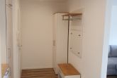 Das Badezimmer ist elegant in weiß und grau gefliest und mit weißer Badkeramik ausgestattet. Der Waschbeckenunterschrank aus Nussbaum und das geflieste Sims bieten Ihnen ausreichend Stellfläche und Stauraum, der Handtuchheizkörper wärmt Ihr Handtuch vor. Selbstverständlich sind ein Fön sowie ein Kosmetikspiegel vorhanden.