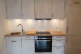 Die vorhandene kleine Küchenzeile ist hochwertig und äußerst ansprechend gestaltet. Ihre moderne Optik in weißgrau, akzentuiert durch eine Arbeitsplatte aus provenzalischer Alteiche und Beschlägen aus glänzendem Edelstahl, zieht sofort die Aufmerksamkeit auf sich.
