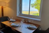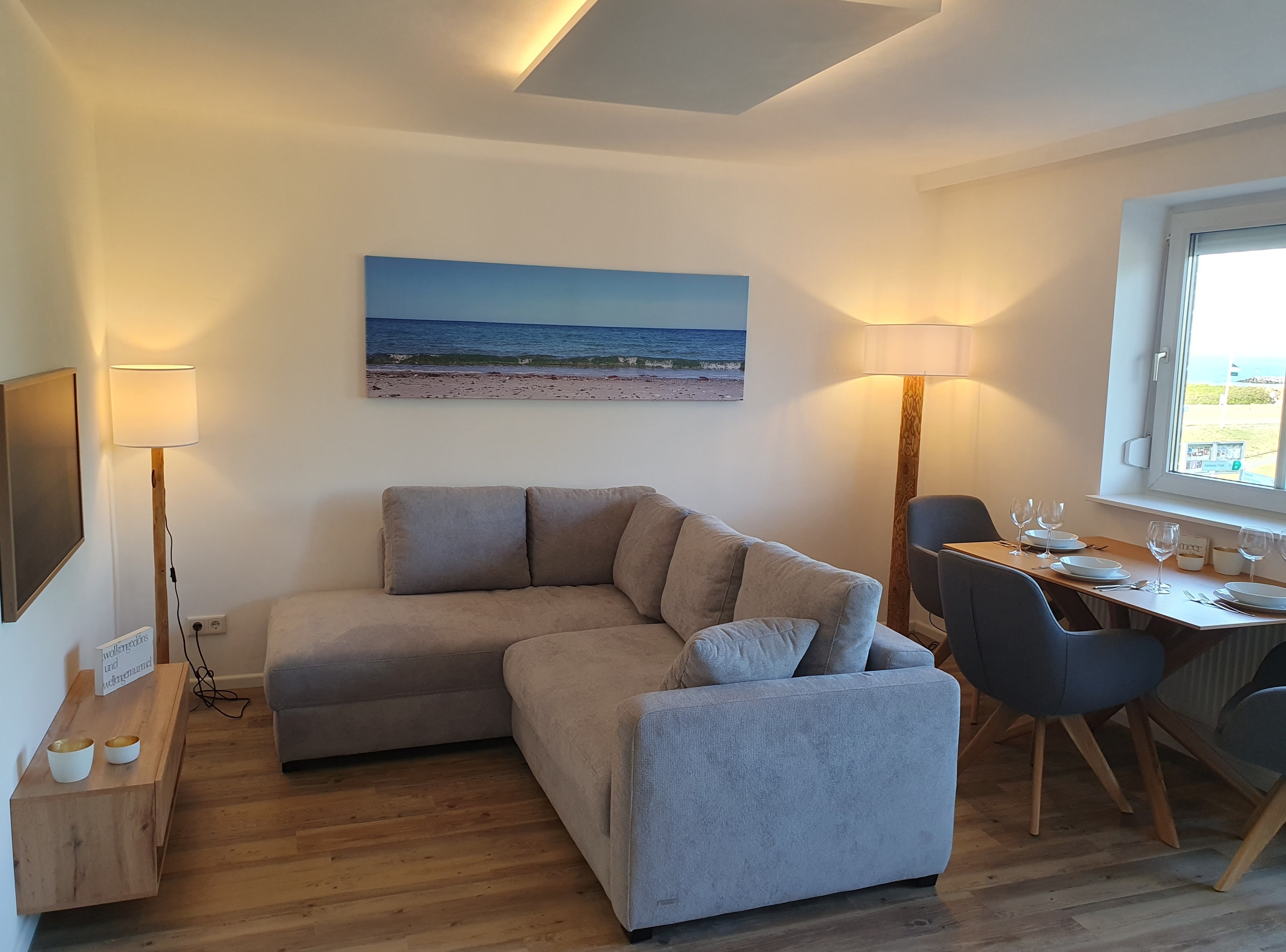 Direkt neben dem Sofa befindet sich ein Esstisch aus massiver geölter Eiche. Dank seiner Platzierung am Fenster können Sie schon beim Frühstück den fantastischen Meerblick genießen. Die drei Polsterstühle am Tisch sind nicht nur äußerst bequem, sondern auch drehbar, um Ihnen maximalen Komfort zu bieten. Mehrere Stehlampen, sowie die indirekte Deckenbeleuchtung des Wohnzimmers erzeugen eine warme und stimmungsvolle Atmosphäre zum Wohlfühlen.