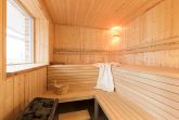 Das Highlight der 5-Sterne-Ferienhäuser ist der große Wellnessbereich mit schönem Erkerfenster und nicht einsehbarem Innenhof. Die geräumige Sauna mit großem, verspiegeltem Außenfenster gibt den Blick frei in die geschützte, mit Büschen und Blumen bepflanzte Gartenanlage der Wellnesshäuser.