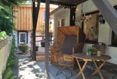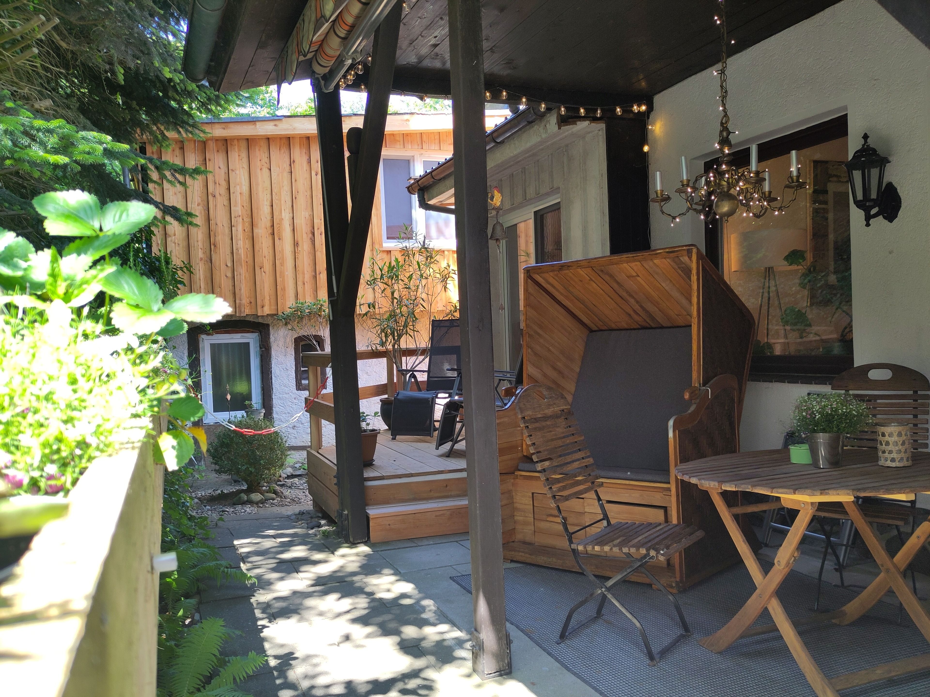 Vor dem Wohnzimmer, angrenzend an einen großen Vorgarten, ist auf einer ca. 25m² großen Terrasse Platz zum gemütlichen Sitzen, Grillen etc.
